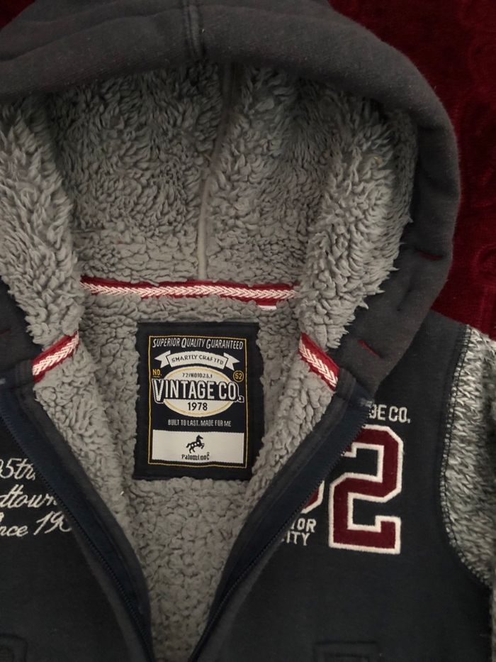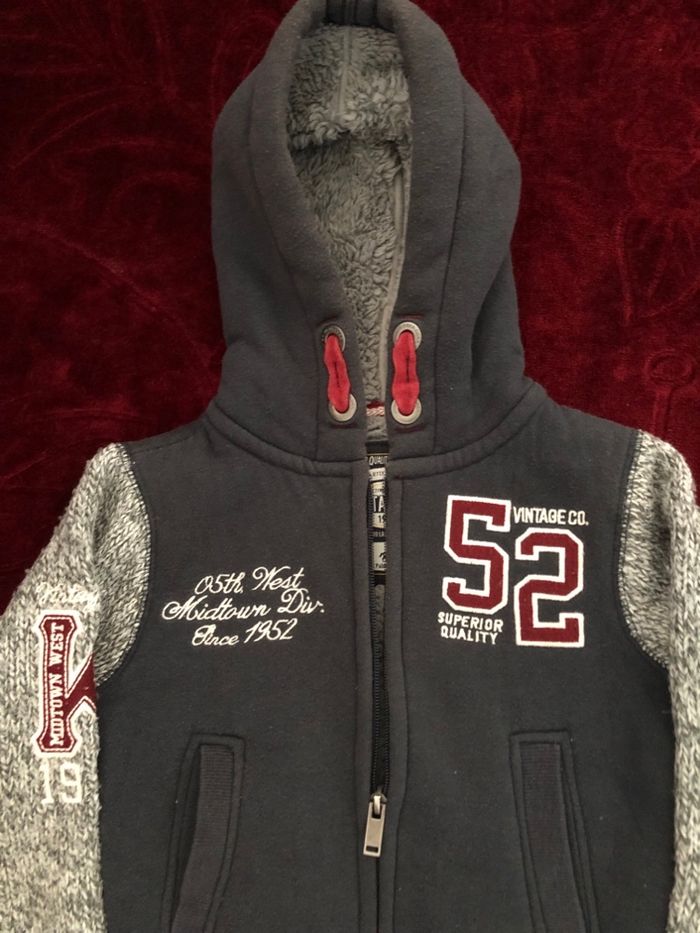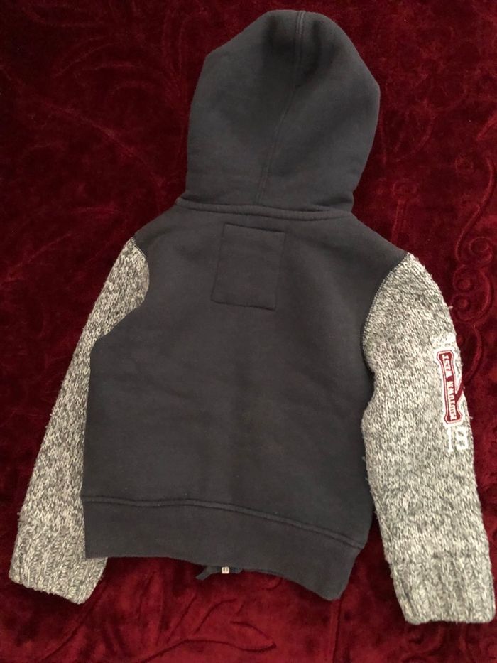 Gilet marine manche grise en laine avec capuche. Doublé polaire très chaud Taille 3-4 ans