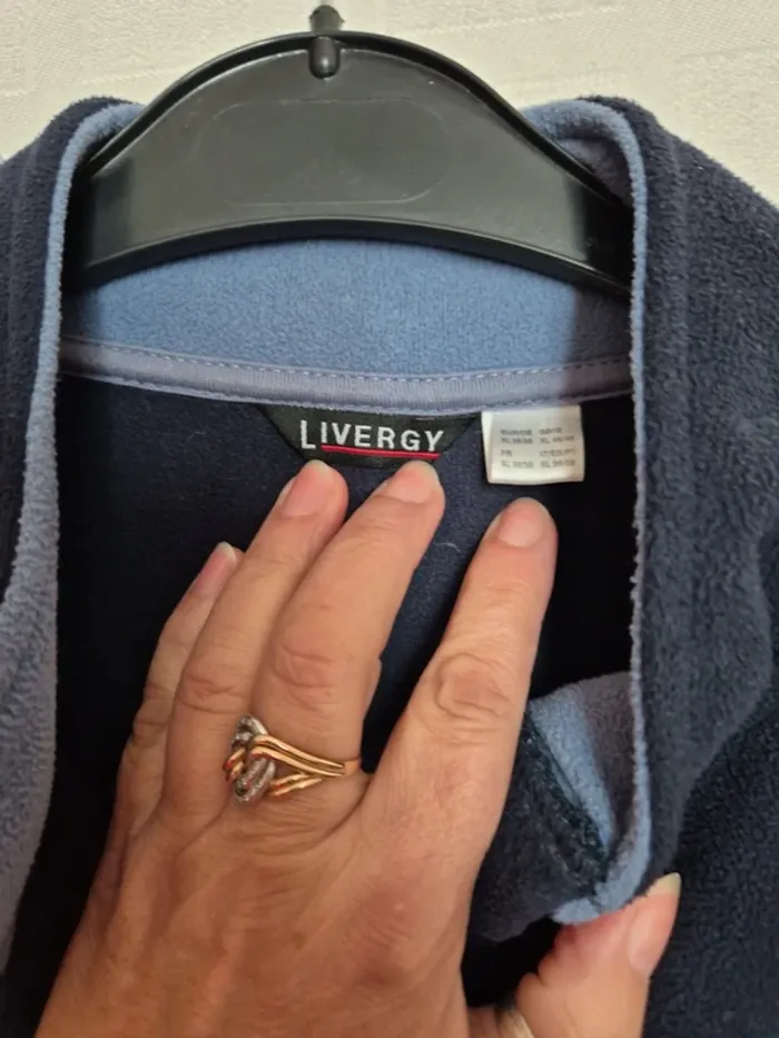 ⬇️mes autres annonces de vêtement homme👉#cg89homme veste polaire avec broderie sur la poitrine et liseré sur les épaules. deux poches latérales et les poignées sont élastiquées. Elle mesure 60 cm aux aisselles et 73 cm de longueur. bon état - taille XL - marque livergy #gilet #veste #polaire #manteau