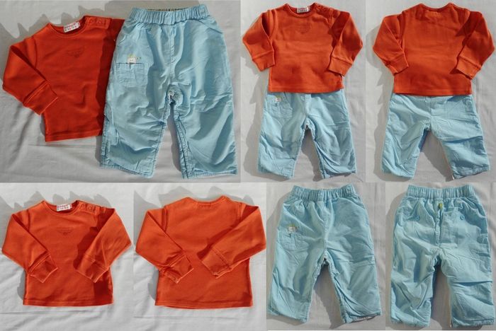 - ensemble pantalon + tee-shirt : tee-shirt ML orange rouille "La Compagnie des Petits" + pantalon bleu ciel entièrement doublé "La Compagnie des Petits"