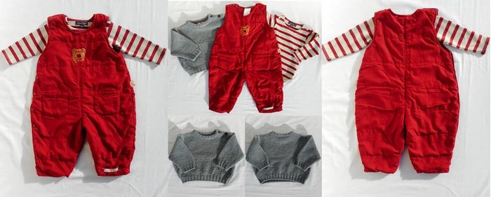 - ensemble salopette + tee-shirt body + pull : salopette chaude bordeaux, entièrement doublée "Ready" + tee-shirt body ML beige rayé bordeaux "DPAM Bébé" + pull en maille gris (52% laine) "Petit Boy" (bouloché...)