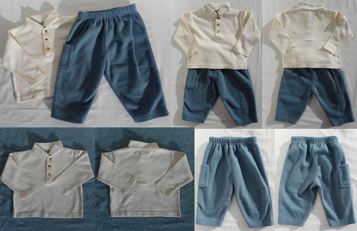 - ensemble pantalon + polo : polo ML beige "Orchestra Basic" (1 petit trou sur une manche + 1 surpiqure en partie défaite sur un bras - cf. photo 10 en bas au milieu) + pantalon / bas de survêtement en polaire bleu/gris