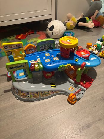 Mon aéroport interactif de V'Tech est un circuit pour tut tut bolides avec des éléments à manipuler : manivelle à tourner sur la tour de contrôle pour faire "voler" l'avion, toboggan, station service, zone de péage avec barrière
