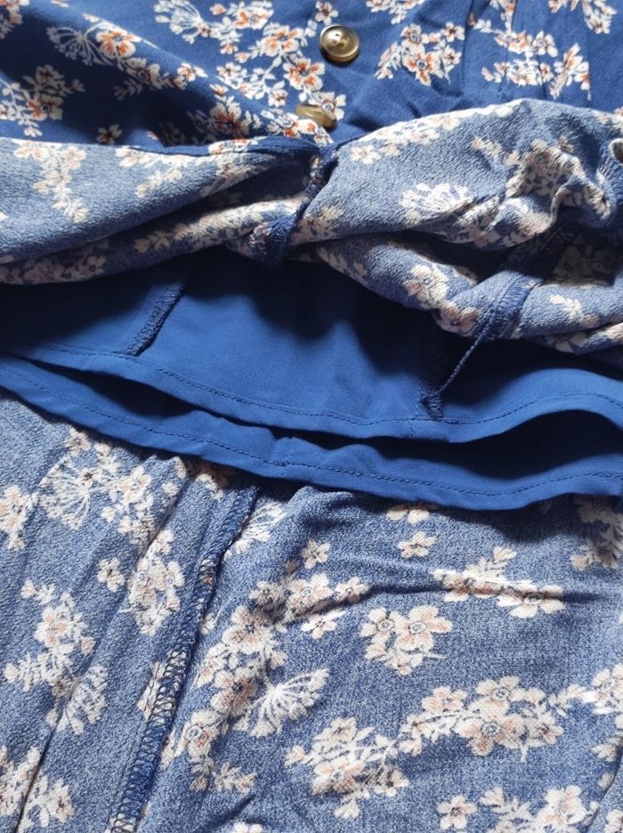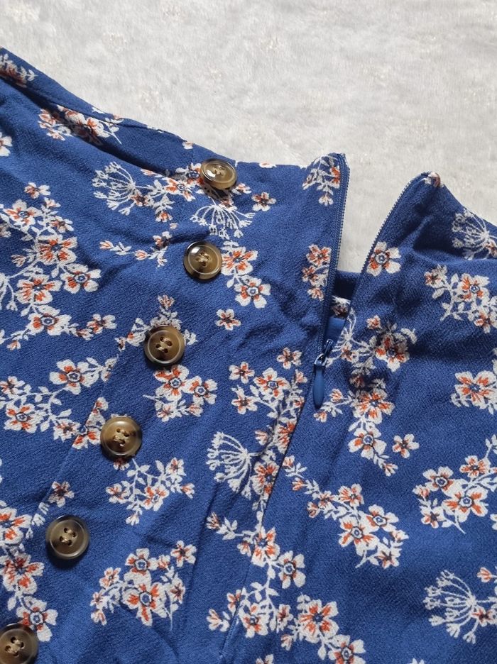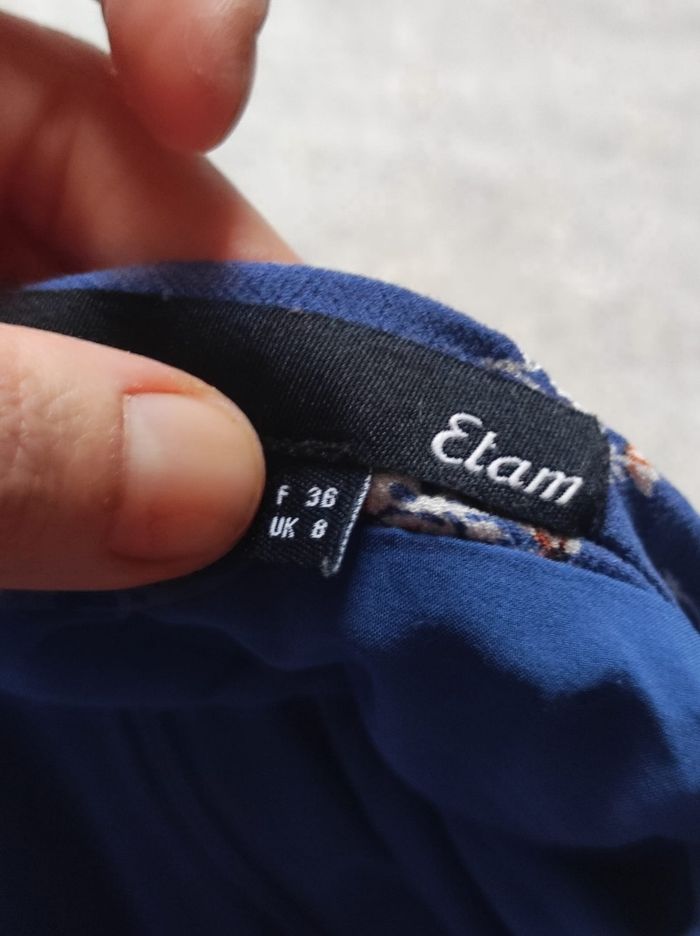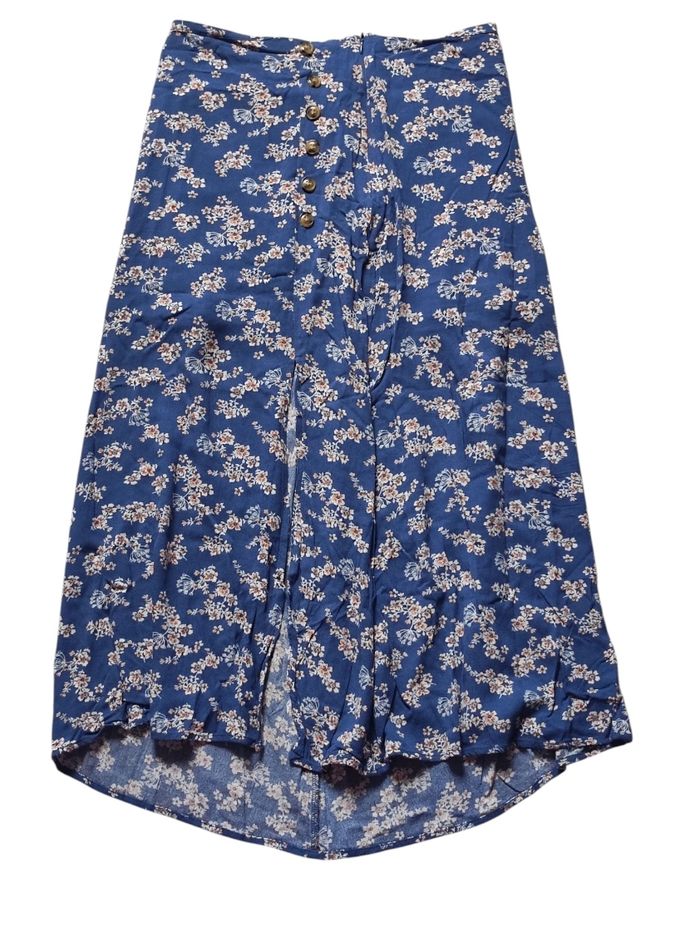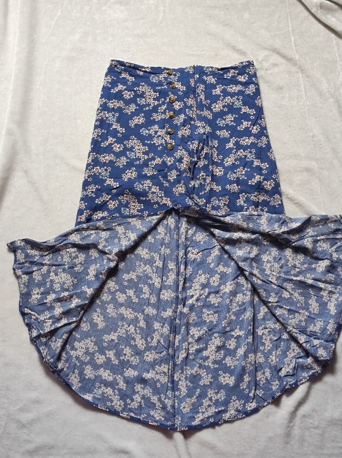 jolie jupe midi bleu imprimé fleurie, ornée de boutons en décoration. Fermeture éclair à porter sur le côté ainsi que la fente. Doublure intérieure courte. Extérieur 100% viscose et intérieur 90% polyester, 10% elasthanne. Marque etam en taille 36 / S. En parfait état, à peine porté.