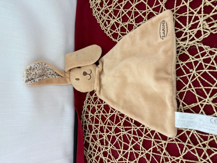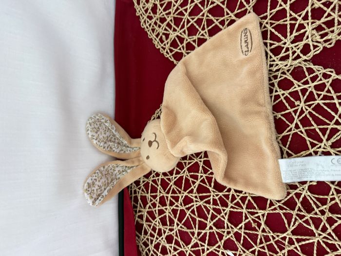 Doudou plat lapin CLARINS beige triangle oreilles tissu fleuris - photo numéro 2