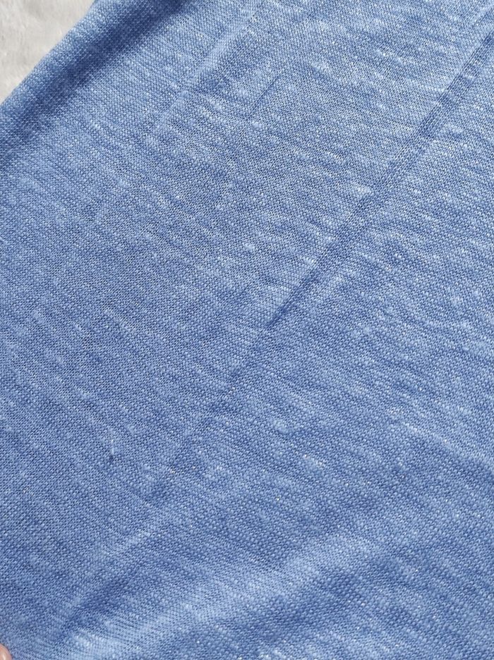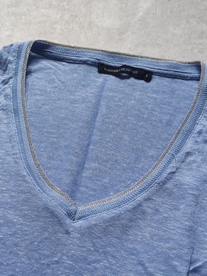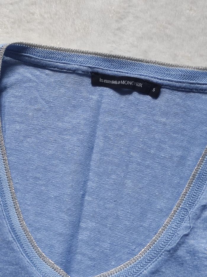 petit débardeur sans manches semi long , bords courbés. Col à fil argenté, couleur bleu clair, très léger et fluide agréable à porter. Petit hic quelques petites bouloches. Marque "les essentiels" monoprix taille S / 36.
