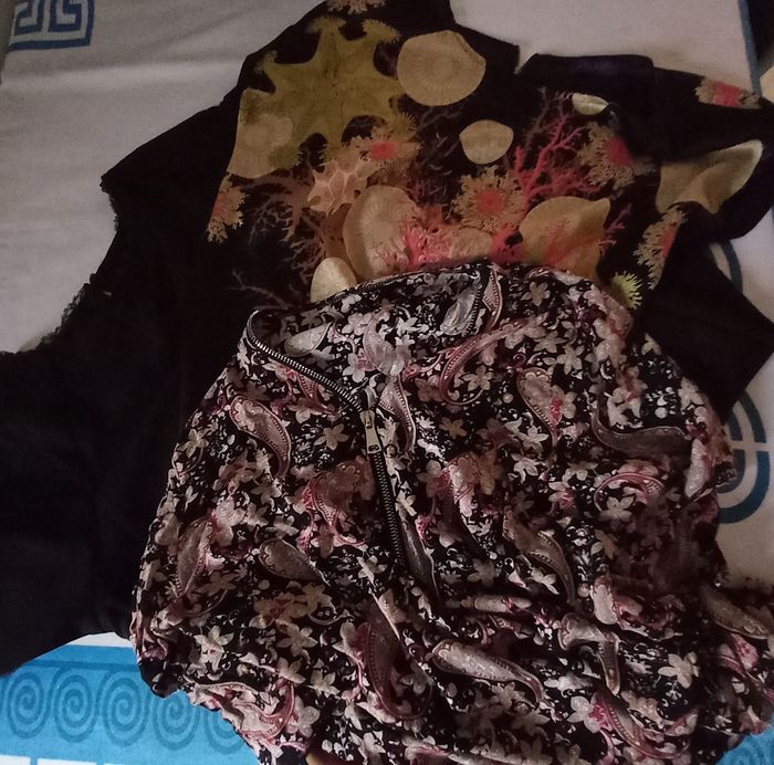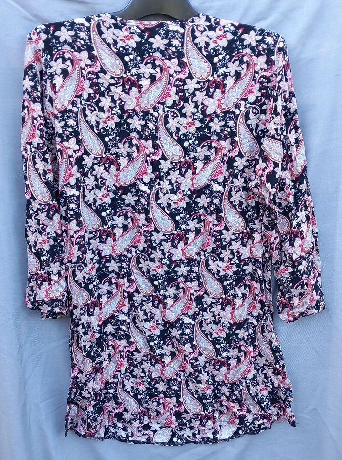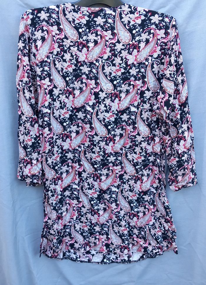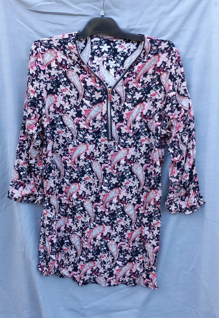 - Robe manches longues, col en v avec Zip,coloris noir et tissu dessin imprimé, petites fentes latérales, composition 100% coton, largeur épaules 43 cm - aisselles 56 cm, Longueur épaule-bas 85 cm- aisselles-bas 61 cm
