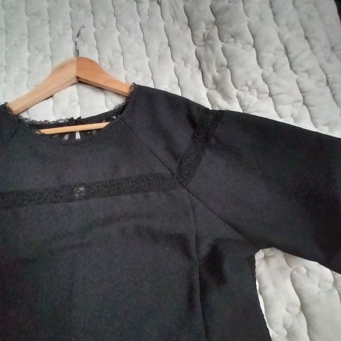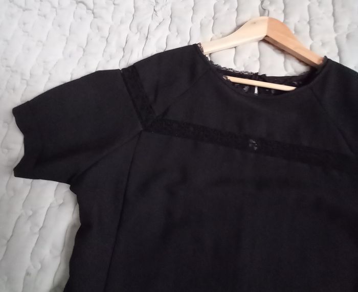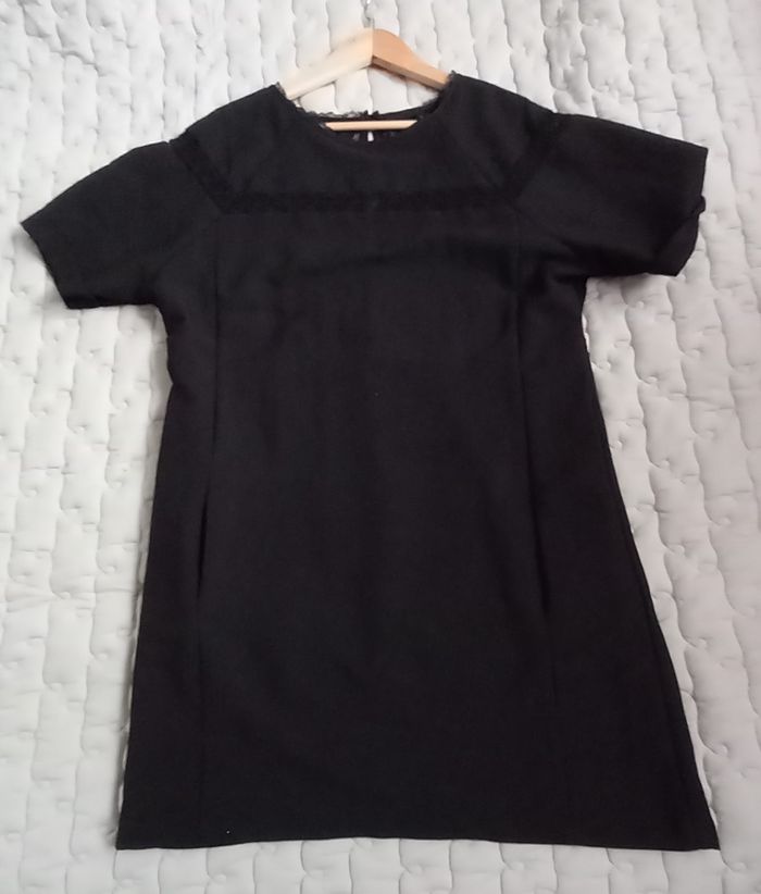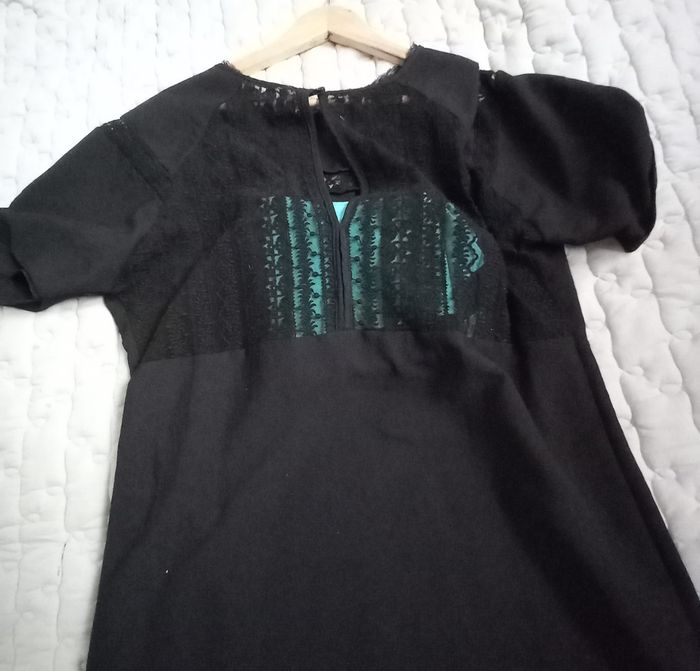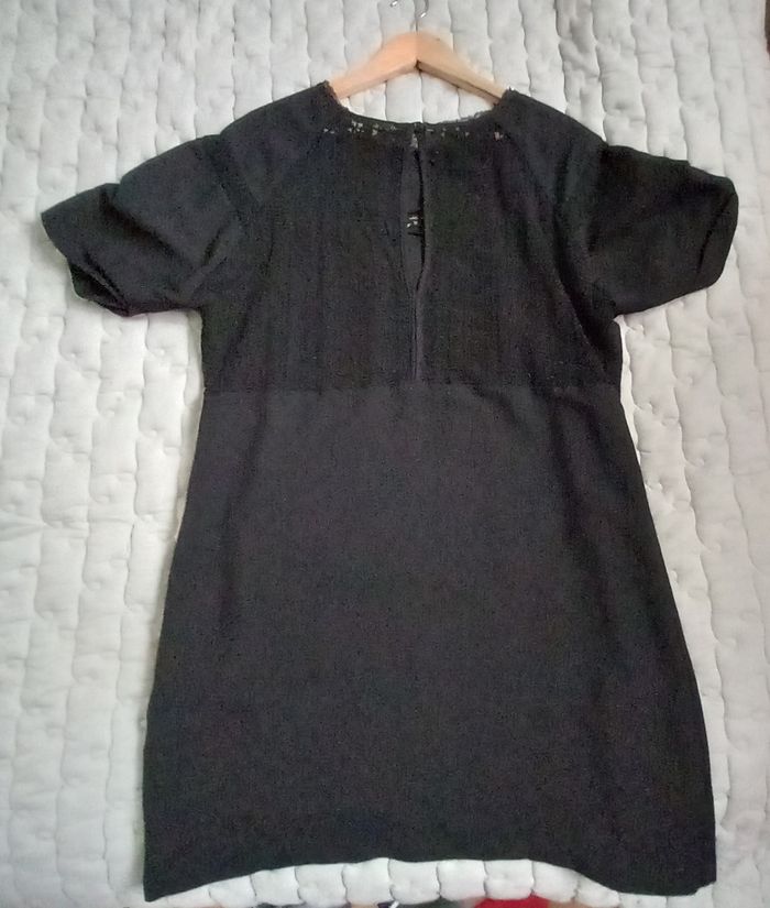 - Robe noire La Redoute, Manches courtes, fermeture goutte d'eau avec bouton au dos et bouton, col rond avec bordure dentelle, coloris noir, découpe dentelle devant et dos, 2 poches, composition coton et polyester, largeur épaules 45 cm - aisselles 60 cm, Longueur épaule-bas 88 cm- aisselles-bas 63 cm