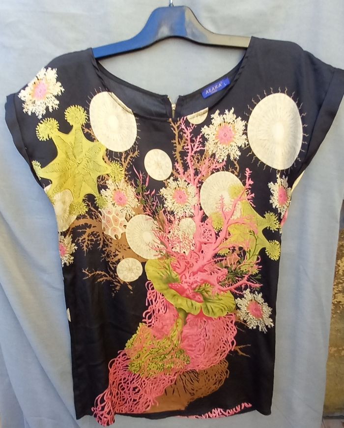 - Robe Azara, Manches courtes, col rond et zip au dos, tissu imprimé effet satiné, coloris du fond noir, étiquette de composition coupée, largeur épaules 47 cm - aisselles 52 cm, Longueur épaule-bas 72 cm- aisselles-bas 54 cm