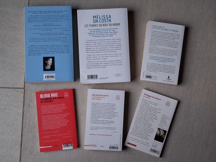 ⚠️Cette annonce comprend 4 romans contrairement à la photo. 2 romans ont été vendus⚠️ ✏️ Les femmes du bout du monde Mélissa Da Costa Edition Albin Michel Prix éditeur : 21,90€ Très bon état - marque manuscrite sur première page et couverture marquée au dos ✏️ La commode aux tiroirs de couleurs Olivia Ruiz Edition Le livre de poche Prix éditeur : 7,40 € Très bon état ✏️ Un secret Philippe Grimbert Edition Le livre de poche Très bon état Prix éditeur : 5.50 € ✏️ La nostalgie de l’ange Alice Sebold NIL Editions Très bon état Prix éditeur : 16.80 € La vie rêvée des chaussettes orphelines (vendu) Les douleurs fantômes (Vendu)