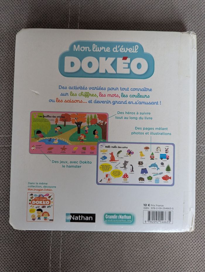 Livre d'éveil Dokéo pour les enfants de 2 à 4 ans. Éditions Nathan Super livre très complet pour les petits ! Chiffres, mots, couleurs, saisons, jeux,.. La couverture a été un peu renforcée avec du scotch, mais l'intérieur étant parfait état. Plein d'autres livres enfants à vendre, n'hésitez pas à composer des lots !
