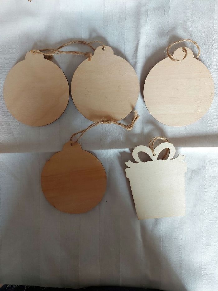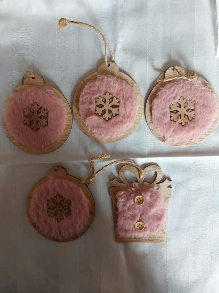 Lot 3/ suspensions pour le sapin, en bois et faux poils Ht 10 x l 8 cm pour le cadeau, diamètre 9 cm pour les boules Neuves