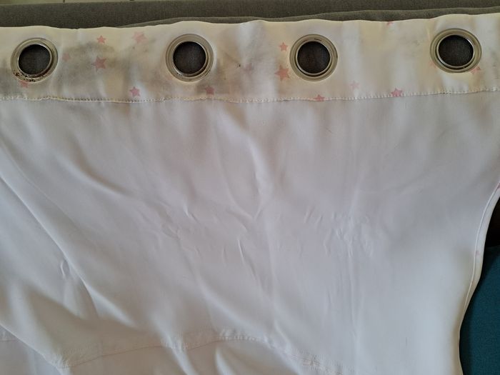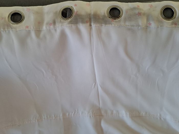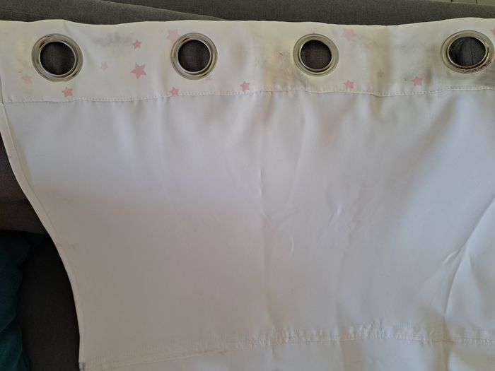 140×260cm Acheté neuf (marque atmosphera for kids) Rideau en polyester, de très bonne qualité, occultant. En très bon état, mis à part les traces noires tout en haut du rideau,au niveau des œillets, dûe à l entrée d air sur la fenêtre (se remarque à peine à l'intérieur une fois le rideau installée). Les traces sont surtout sur le côté extérieur(côté entrée d'air donc).