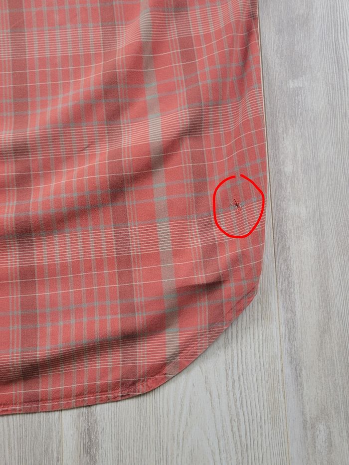À signaler : 3 petits trous à l’avant et 1 à l’arrière, discrets et positionnés bas (environ 61 cm du haut) — donc invisibles une fois la chemise portée rentrée dans le pantalon. ( voir photos)