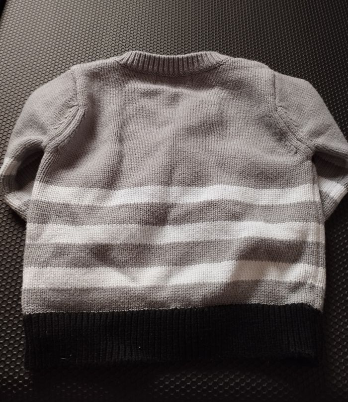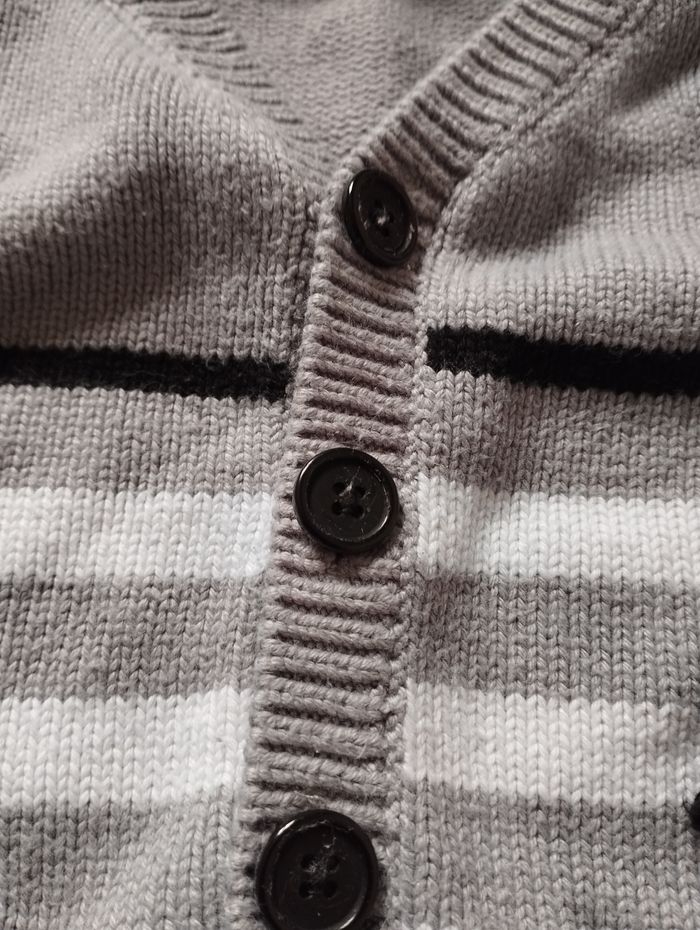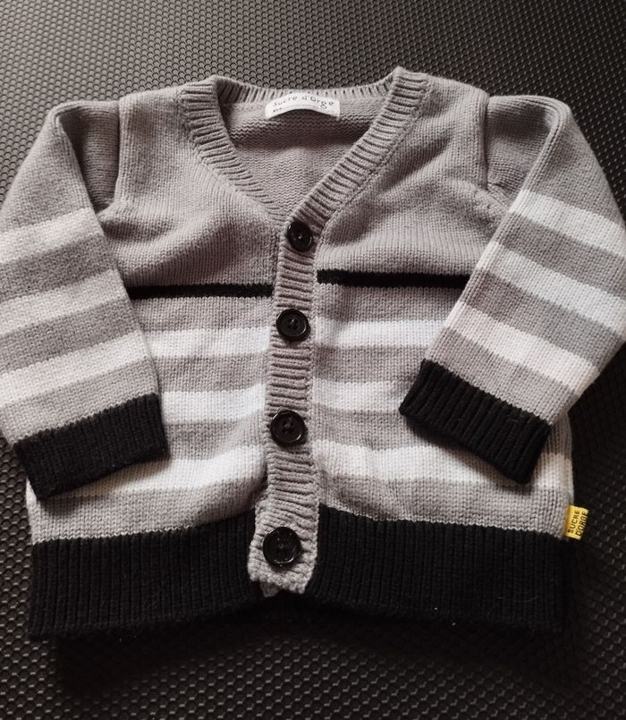 Gilet bébé garçon de la marque Sucre d'orge. C'est du 9 mois. Il est rayé gris, blanc et noir (le gris ressort mal en photo car en vrai il est plus foncé). Il est boutonné sur le devant. Il a des manches longues. 60% de coton, 20% de viscose et 20% de polyamide. Il est en bon état car il y a quelques bouloches et la matière est un peu rêche.