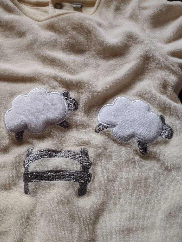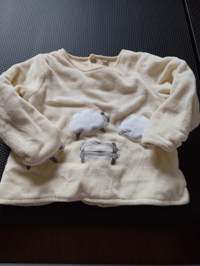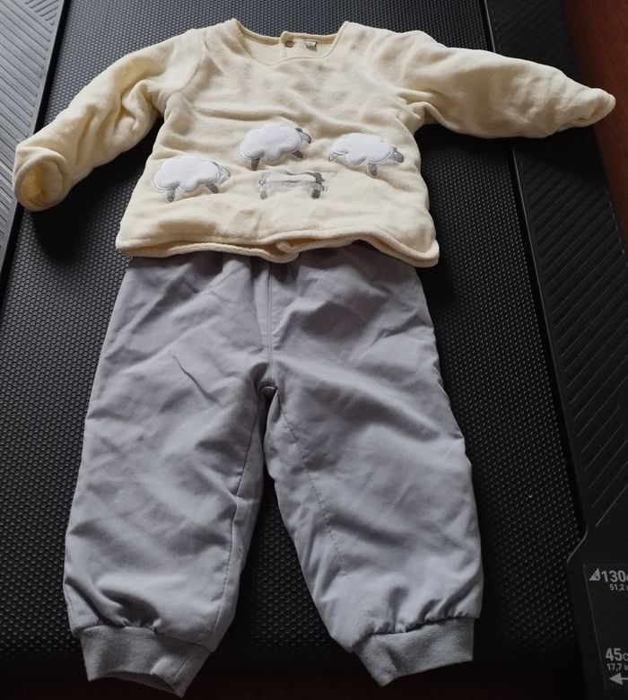 Ensemble bébé garçon sans marque. C'est du 9 mois. Le haut est jaune pâle avec des moutons. Il est à manches longues, a des boutons pression à l'arrière et a une matière comme les dors bien. Le bas est un jogging gris. C'est en polyester et coton. C'est en très bon état.