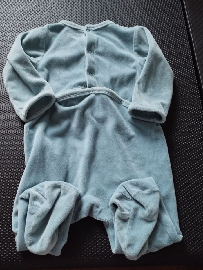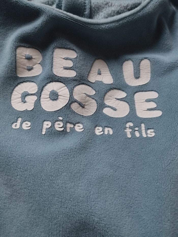 Dors bien bébé garçon de la marque Kimbaloo. C'est du 12 mois. Il est bleu ciel avec une inscription blanche sur le devant (qui est légèrement abîmée). Il a des manches longues et des boutons pression à l'arrière. 100% de polyester. Il est en très bon état.