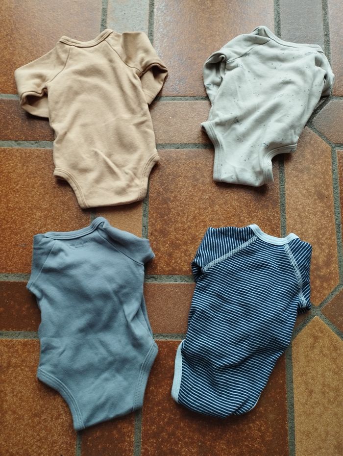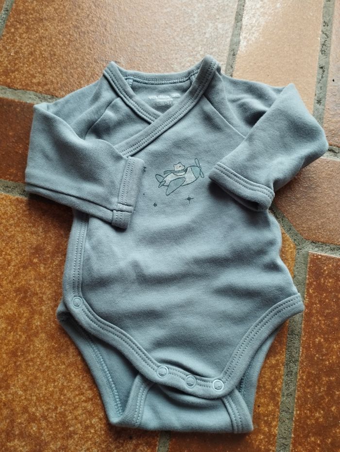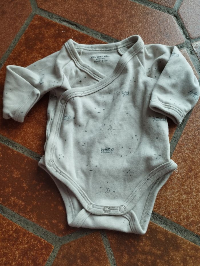 Lot de bodies bébé garçon des marques In extenso, Vertbaudet et sans marque. C'est du 1 mois. Il y en a un couleur beige foncé In extenso. Il y en a un gris clair avec des petits ours en avion Verbaudet. Il y en a un bleu gris avec un ours en avion Vertbaudet. Il y en a un bleu à rayures sans marque. Ceux de Vertbaudet sont en coton bio. Ils sont en très bon état.
