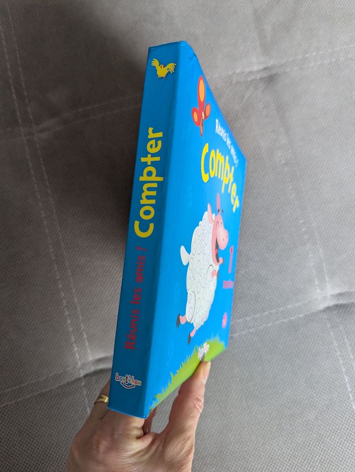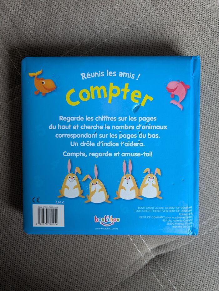 Un livre pour apprendre à compter, éditions bout'chou. Pages cartonnées bien solides pour les petites mains. L'intérieur est en très bon état, la couverture est en bon état. Regarde les chiffres sur les pages du haut et cherche le nombre d'animaux correspondant sur les pages du bas. Un drôle d'indices t'aidera. Compte, regarde et amuse-toi ! Beaucoup de livres enfants à vendre, n'hésitez pas à composer des lots !