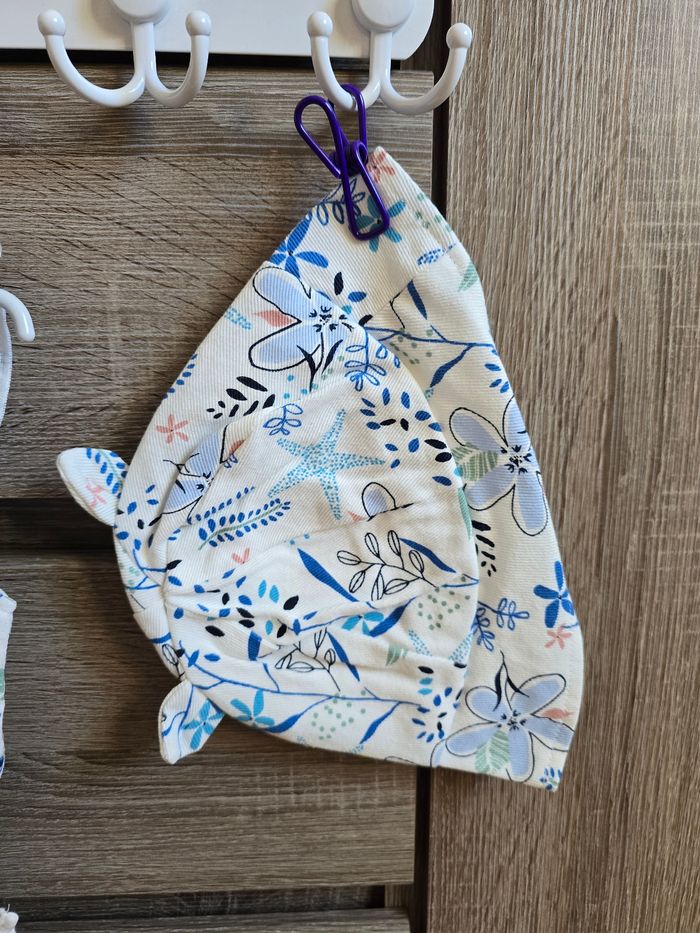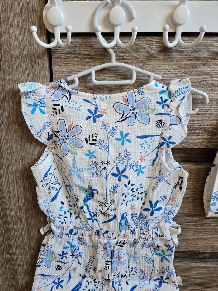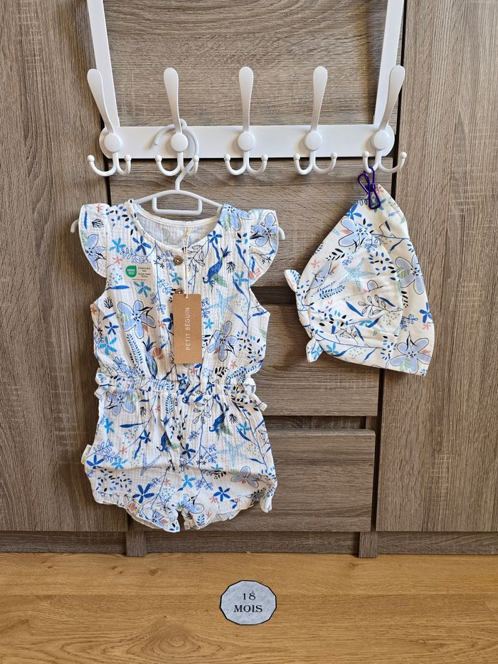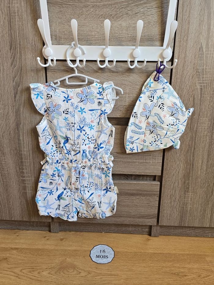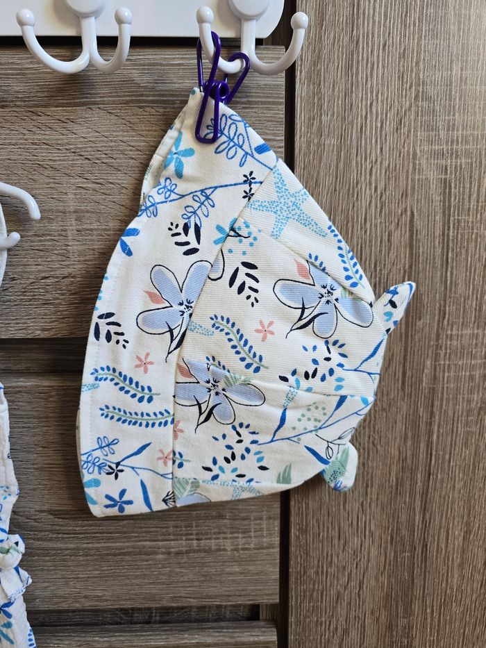 📜 Combi-short bleu + chapeau en gaze de coton. Modèle Océan d’amour