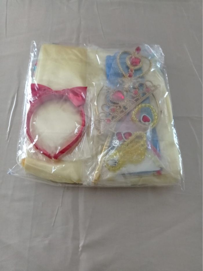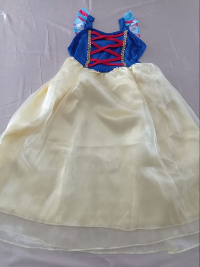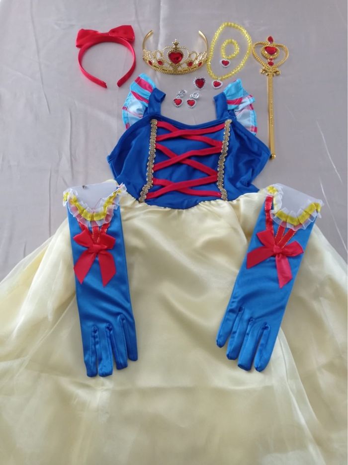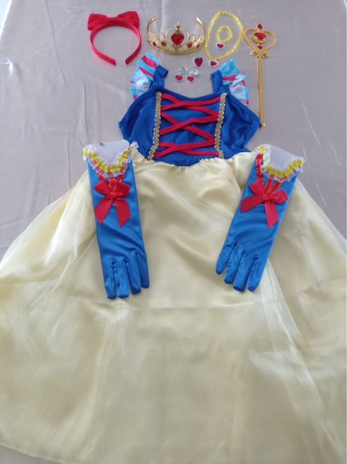 Déguisement robe princesse blanche neige et ces accessoires (couronne, baguette, serre tête, gants, collier, boucle d’oreille et bague). La robe mesure 75cm de longueur, la taille convient aux petites filles de 4-5ans. Totalement neuve, vendue dans son emballage d’origine. Expédition rapide après votre commande