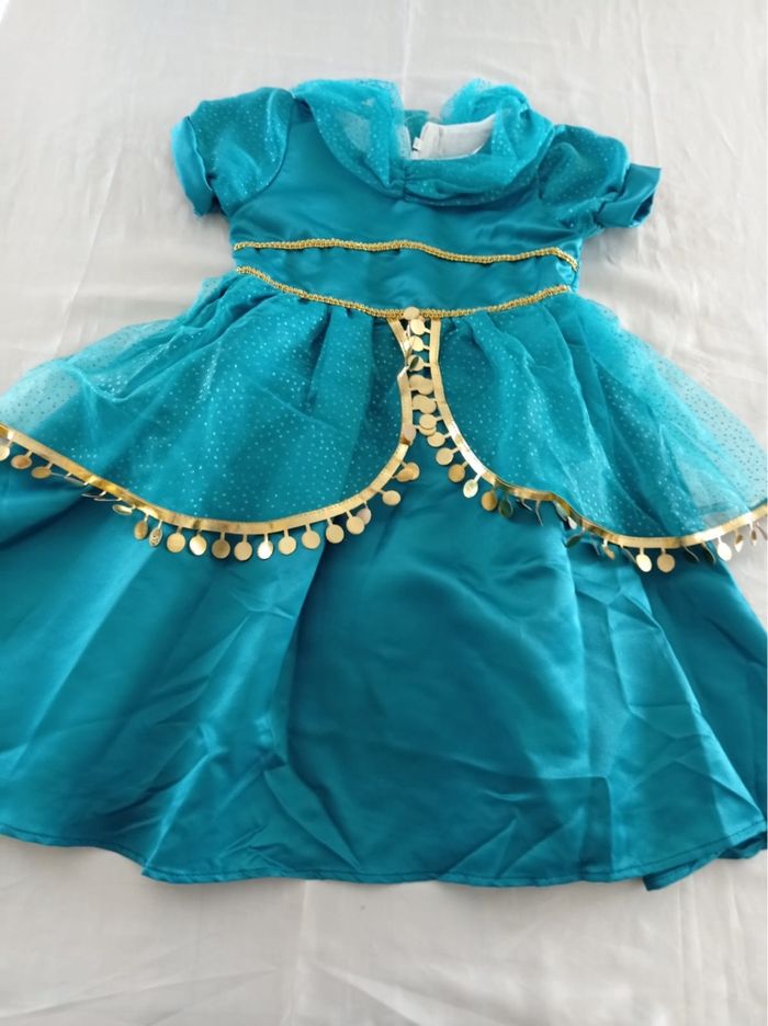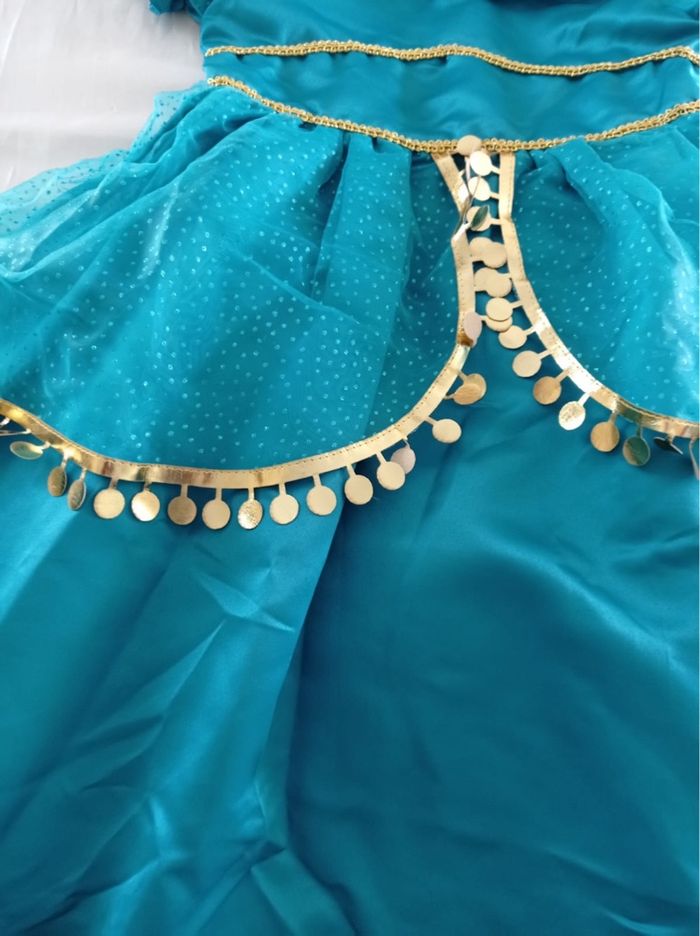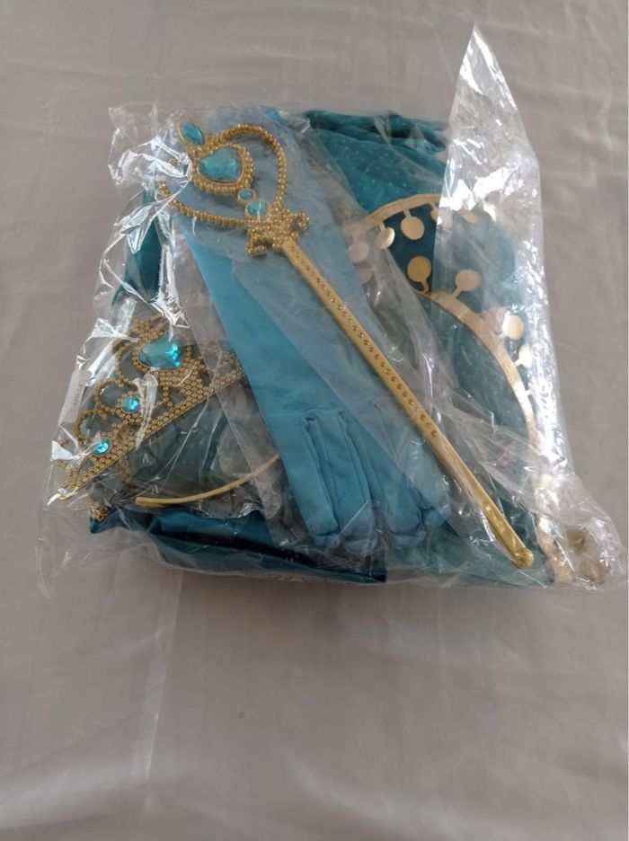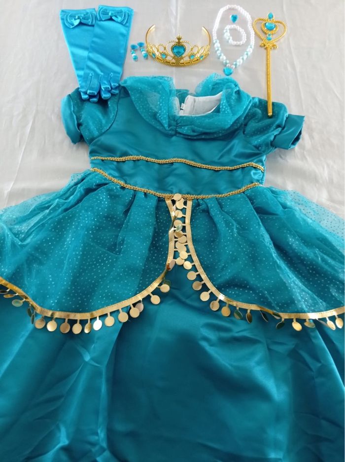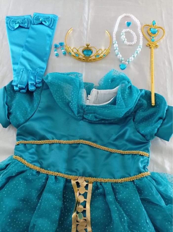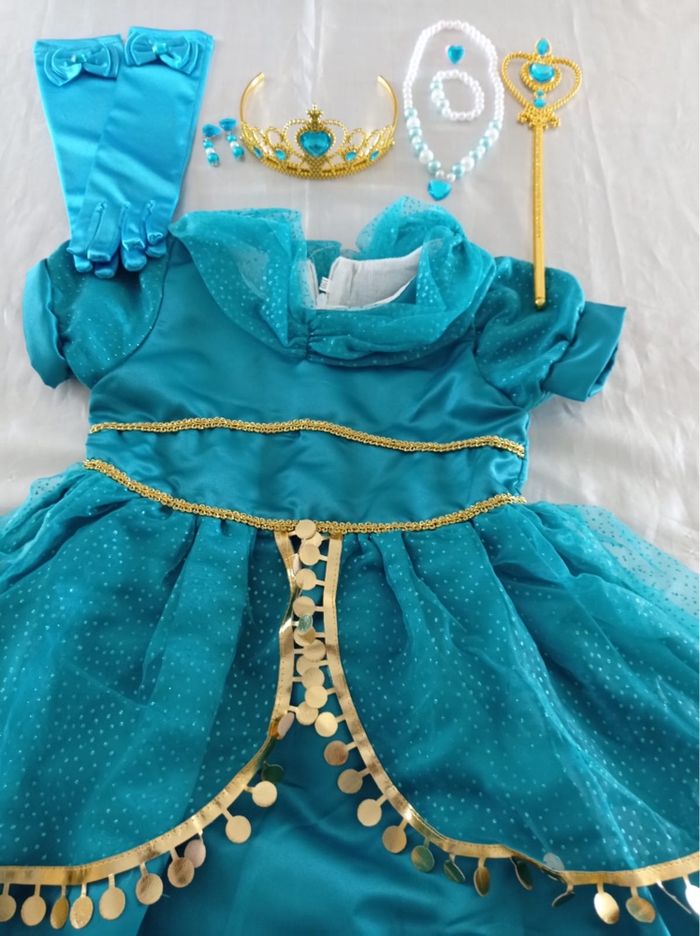 Déguisement robe princesse Jasmine courte et ces accessoires (couronne, baguette, gants, bijoux). La robe mesure 65cm de longueur, la taille convient aux petites filles de 4-5ans. Totalement neuve, vendue dans son emballage d’origine. Expédition rapide après votre commande