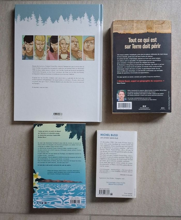 ✏️Un avion sans elle version BD Neuve Edition : Glenat Prix éditeur : 25 € Peut être offerte Première édition ✏️ Un avion sans elle Livre de poche aux éditions Pocket Prix éditeur : 9.6 € Très bon état ✏️ Tout ce qui est sur Terre doit périr Edition Presses de la Cité Prix éditeur : 22 € Bon état ✏️ Au Soleil Redouté Editions De Noyelles Prix éditeur : 21.9 € Bon état Prix éditeur pour le lot : 78,50€ Vendu 40 € Livraison acceptée Ou remise en main propre possible sur Paris, La Défense, Etampes, Bibliothèque François Mitterrand, Gare de Lyon, etc... N'hésitez pas à constituer un lot.