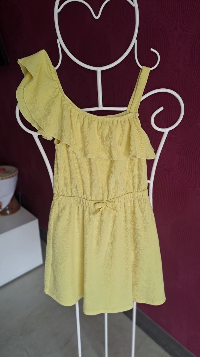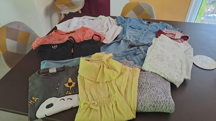 2 robes, un combishort, un débardeur, 2 Tee-shirts manches longues,1 croc top orange,1 débardeur sport, 1 cache coeur/gilet,1 pull 1 jean