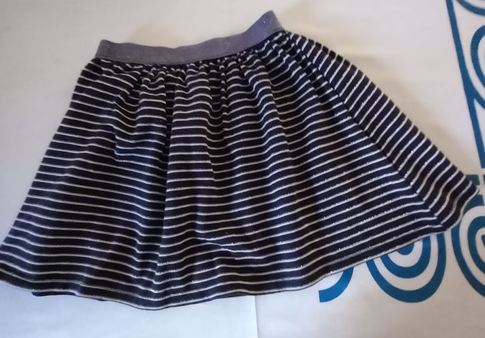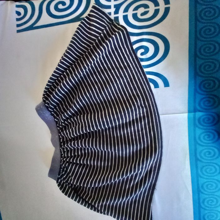 Jupe patineuse, large élastique à la taille brillante, coloris bleu marine, tissu imprimé à rayures blanches, à enfiler, composition 49% polyester 45% coton 6% fils métallisés, Made in France Possibilité d offre en lots. Envoi rapide et soigné