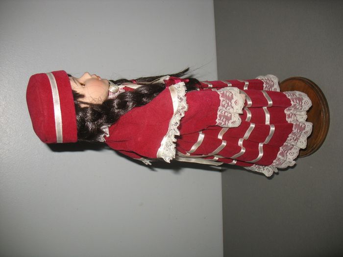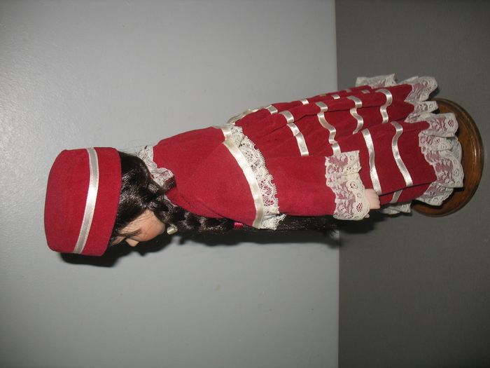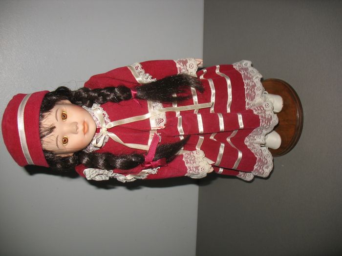#Collections_Nathg2210 POUPÉE DE PORCELAINE LAURA "THE CLASSIQUE COLLECTION" - n°02 Poupée de porcelaine - Robe bordeaux en velours - Chapeau et cape - Tresses dans les cheveux - Avec support - Hauteur : 43 cm. Article d’occasion en très bon état – Nettoyé pour la vente - Pas de carton d'origine. Possibilité d'envoyer d'autres photos sur simple demande. Maison non-fumeur - Sans animaux. Réduction lot activée. Allez voir mes autres ventes, je vide les placards. Beaucoup de vêtements de marque et beaucoup de jouets. Remise en mains propres ou possibilité d'envoi au tarif en vigueur à votre charge. Retour Refusé. Pour tout renseignement, n'hésitez pas à me contacter, je répondrai volontiers à vos questions. Réponse Assurée. Pour Consulter mes autres annonces tapez Nathg2210.