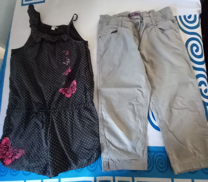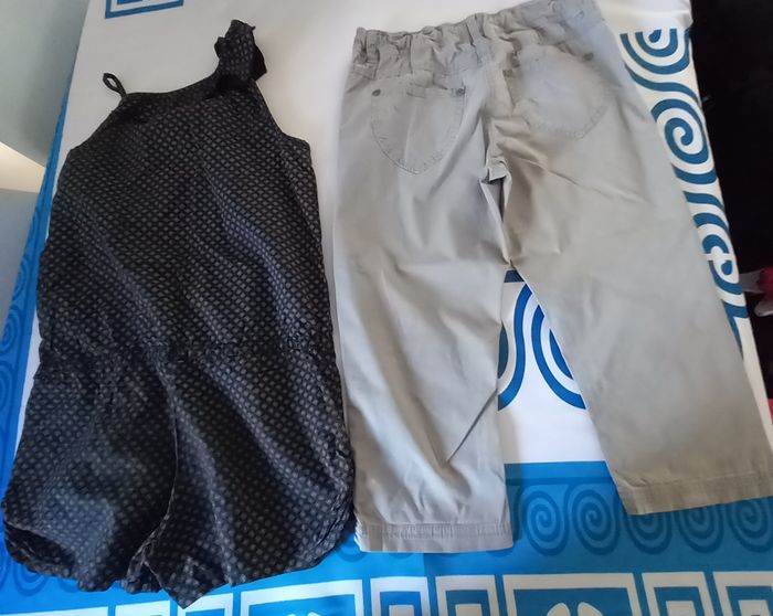 - Pantalon Gémo, taille ajustable avec élastique et boutons, ceinture avec passants, 5 poches avec rivets, fermeture avec bouton et Zip, coloris gris, 98% coton 2% élasthanne - Combishort Orchestra,élastique à la taille et cordon de serrage, coloris noir, tissu dessin imprimé, à enfiler, Bretelle sur 1 épaule et volant sur l'autre composition 100% coton Possibilité d offre en lots. Envoi rapide et soigné