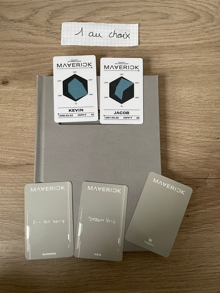 ⚠️lisez la description vnted et leboncoin : woosanra beebs : floraritz 📓 album Maverick 👥 The Boyz #woosanraTHEBOYZ 🗂️ version STORYBOOK grise 📔 complet : - une id photocard au choix ✅ kevin ✅ jacob SOUS RÉSERVE DE DISPONIBILITÉ. Avant achat m’envoyer un message pour savoir si la pc que vous souhaitez est disponible. si vous ne m’envoyez rien je mettrais une pc au hasard - 1 photocard New/Chanhee - 1 photocard Sunwoo - 1 photocard unit Kevin & Jacob - 1 poster Hyunjae 🔎 très bon état juste de légères rayures sur le devant. ➕ la version blanche est également disponibles dans mon dressing