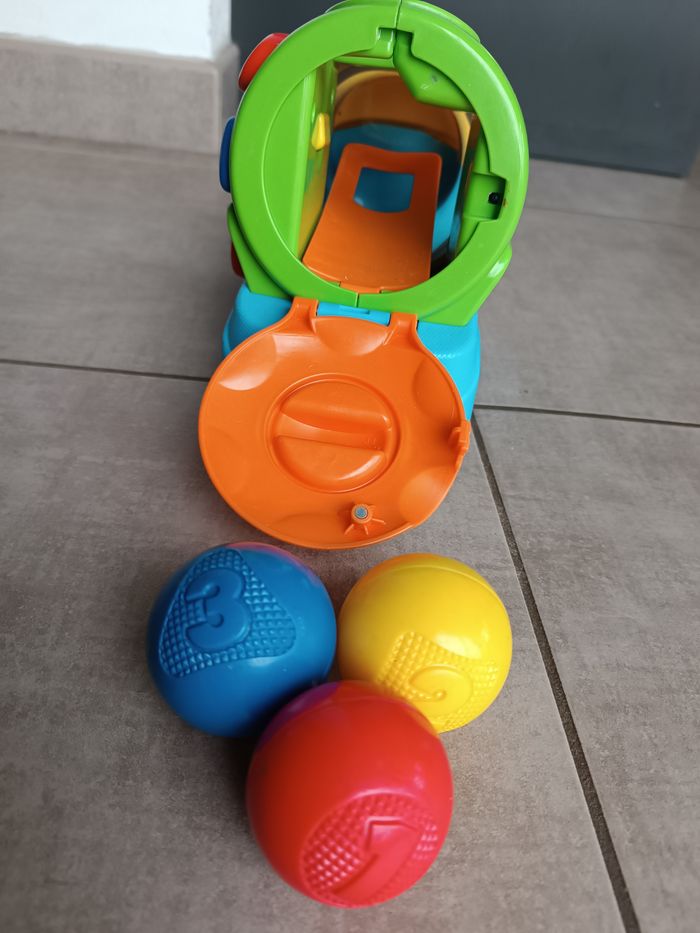 Ce camion parlant et musical reconnaît les couleurs et s'illumine en fonction. Bébé glisse les balles colorées dans le camion qui les reconnaît et s'illumine avec chaque couleur. Le camion mixe également les couleurs : Bébé insère plusieurs balles puis appuie sur la manivelle et découvre le résultat : « Du bleu et du rouge font du violet ». 3 modes de jeu: Apprentissages, Découvertes et Musique. 3 boutons interactifs pour découvrir les premiers chiffres, les formes et les couleurs. Une ouverture à l'arrière pour récupérer les balles colorées fournies. 1 chanson et 5 mélodies. Réglage du volume sonore et arrêt automatique. Boîte Try-me. Il convient aux enfants de 1 à 3 ans.
