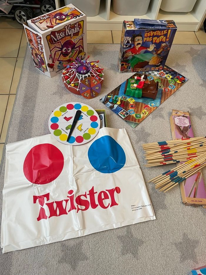 Vend ce lot de jeux pour enfants: Réveil pas papa , Miss Kipik Le Twister , hopla Banana et un mikado géant plus de 40 cm Les 5 jeux sont complets et avec des piles fonctionnelles pour ceux qui en ont.