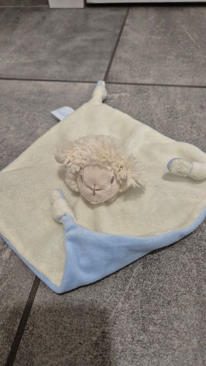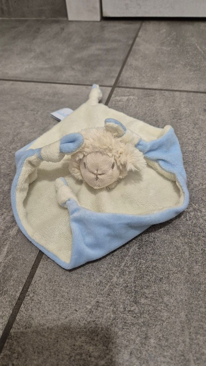 Doudou plat mouton, de couleur écrue sur le dessus et bleu ciel sur l'envers. Coton tout doux, toucher velours. 100% coton. Marque Avène Pédiatril. Dimensions : carré de 21 cm sur 21 cm. Neuf, jamais utilisé. Propre et lavé.