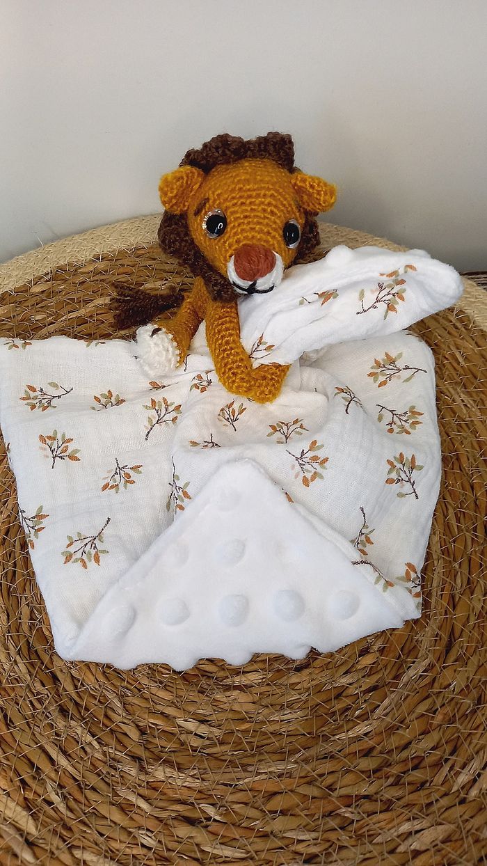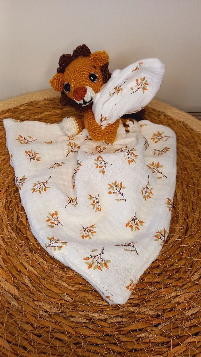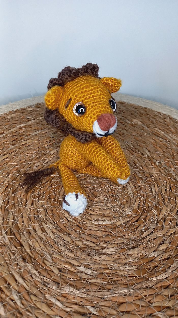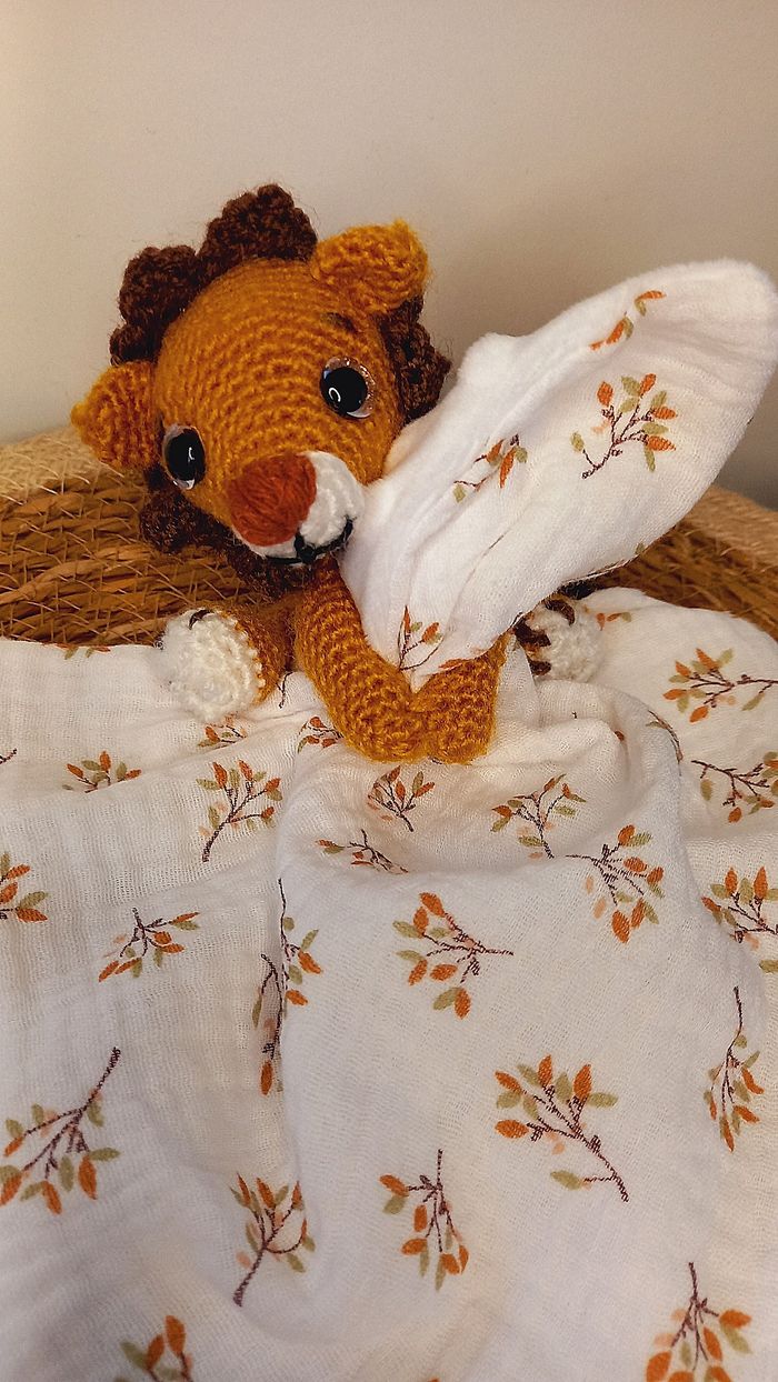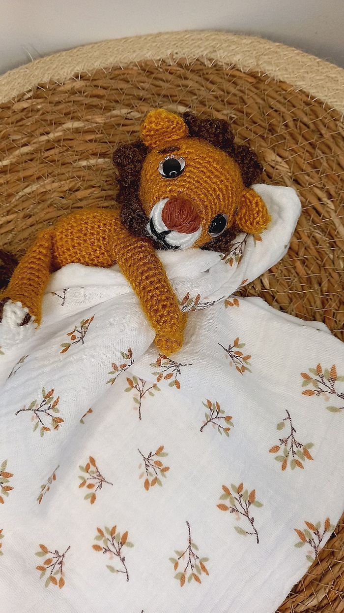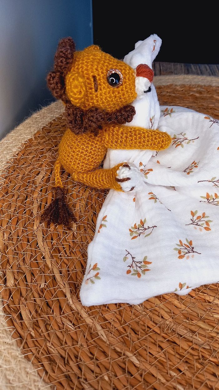 doudou pour votre bébé composé de cette mignone petite peluche amigurumi petit lion 🦁 couleur jaune moutarde ,brun
