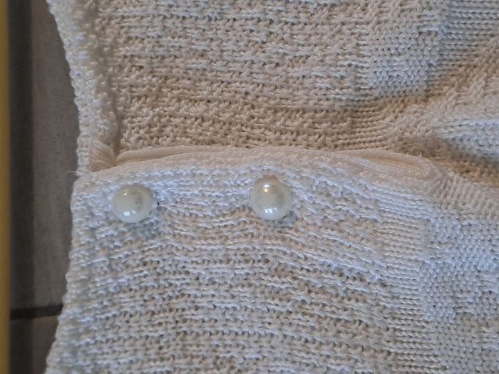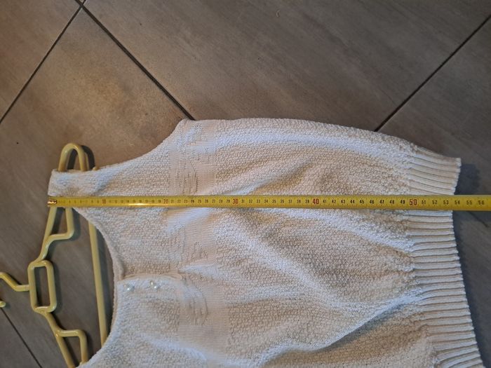 Débardeur en maille vintage Sans manches Avec 2 boutons perles Couleur blanc cassé / crème 100% Acrylique Fabriqué en France 🇫🇷 Production U.T.T Pas d'étiquette de taille (mesure en photo)
