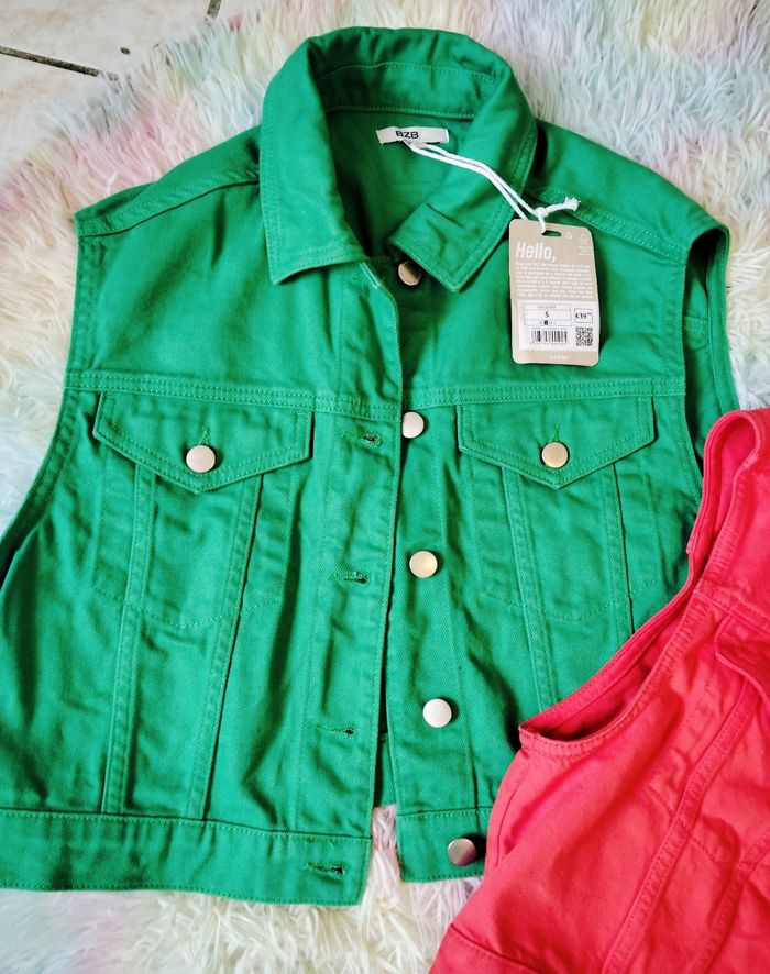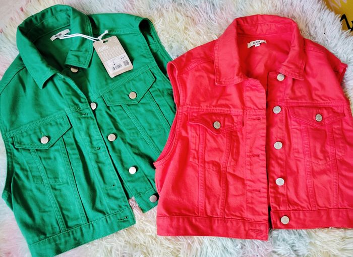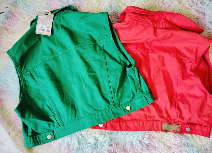 Lot de 2 vestes courtes jean beezbee bzb vert & rouge orangé. 25 euros le lot ou 15 euros pièce. #vestejean #vestecolore #vestecourtejean #vesteverte #vesterouge #vesteorange #vestecoloree