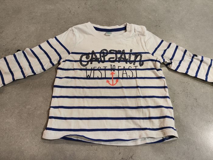 Je vends un lot de 4 t-shirts pour bébé garçon + un body manches longues, taille 18 mois, tous en bon état, soigneusement entretenus dans un foyer non-fumeur. Marques : Tex Baby, Gémo, Grain de Blé, Tape à l’œil. 👕 Contenu du lot : - T-shirt Tex Baby blanc à rayures bleues, boutons pression à l’épaule - T-shirt Gémo blanc à rayures grises, col vert, bouton décoratif sur le devant - T-shirt Gémo bleu marine, deux boutons pression au dos - T-shirt Grain de Blé blanc à rayures grises, petits bonhommes imprimés sur le côté, boutons pression à l’épaule - Body Tape à l’œil clair, motif renard , boutons pression à l’entrejambe 🧼 Tous les vêtements sont propres, sans taches ni trous,