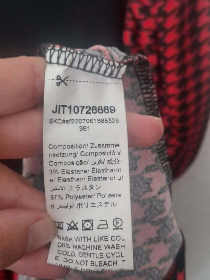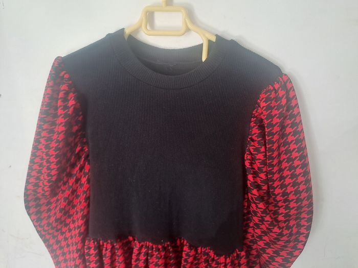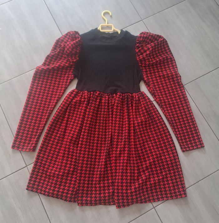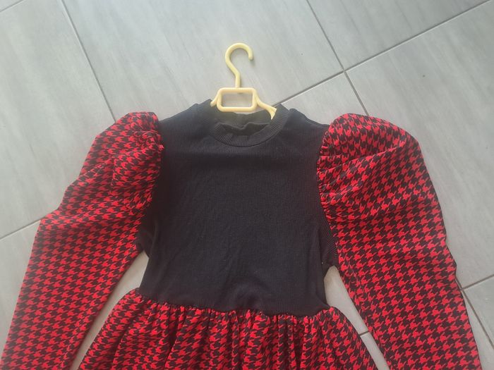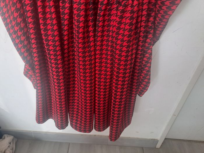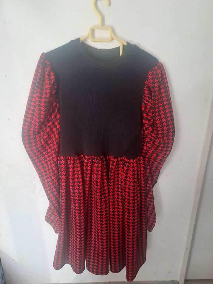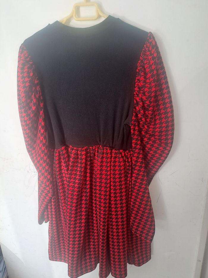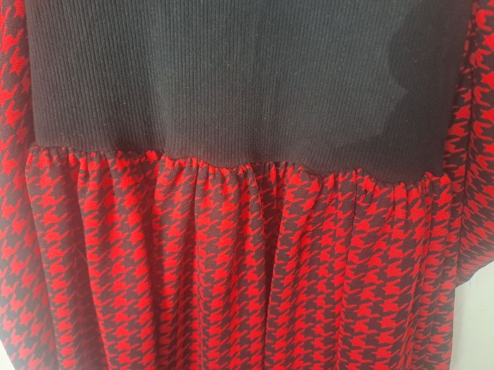 Robe plutôt épaisse Manches longues et bouffantes Partie jupe longueur mi longue à longueur genou suivant votre taille Partie manches et jupes motifs pied de poule Couleur rouge et noir Partie buste Couleur noir Pas d'étiquette de taille, pouvant convenir à plusieurs taille Pas d'étiquette de marque