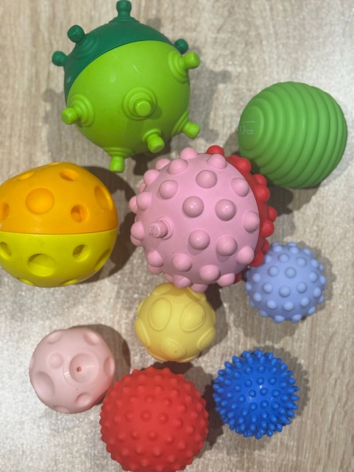 Balles sensorielles, différentes grosseurs, différentes couleurs, différents motifs.