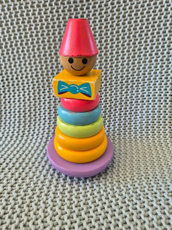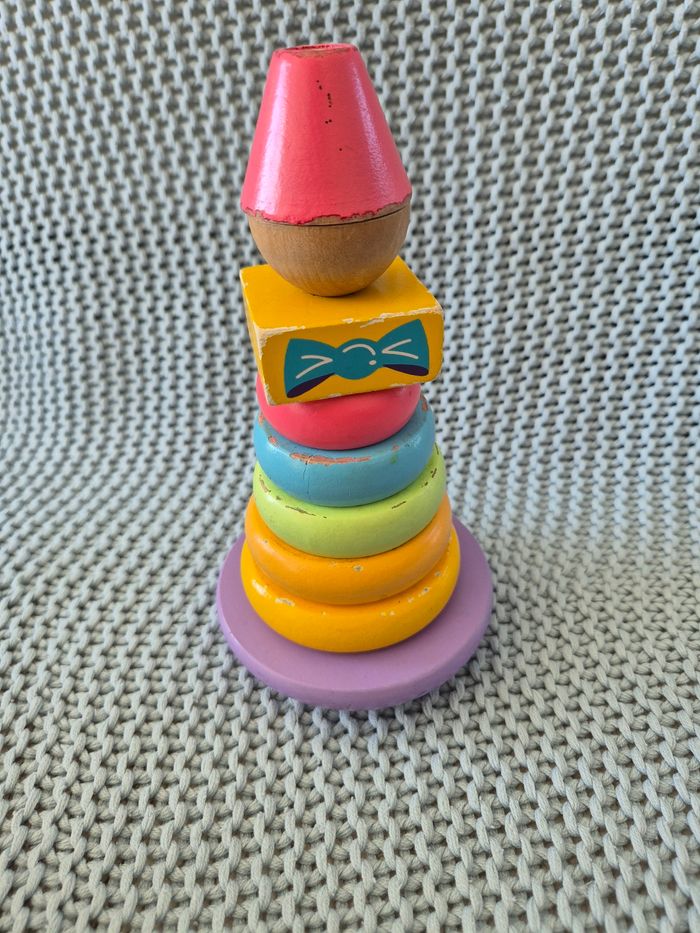Jouet culbuto en bois avec anneaux à empiler. Plusieurs éclats sur la peinture. #mimidacenfant #mimidacjouets #mimidacéveil