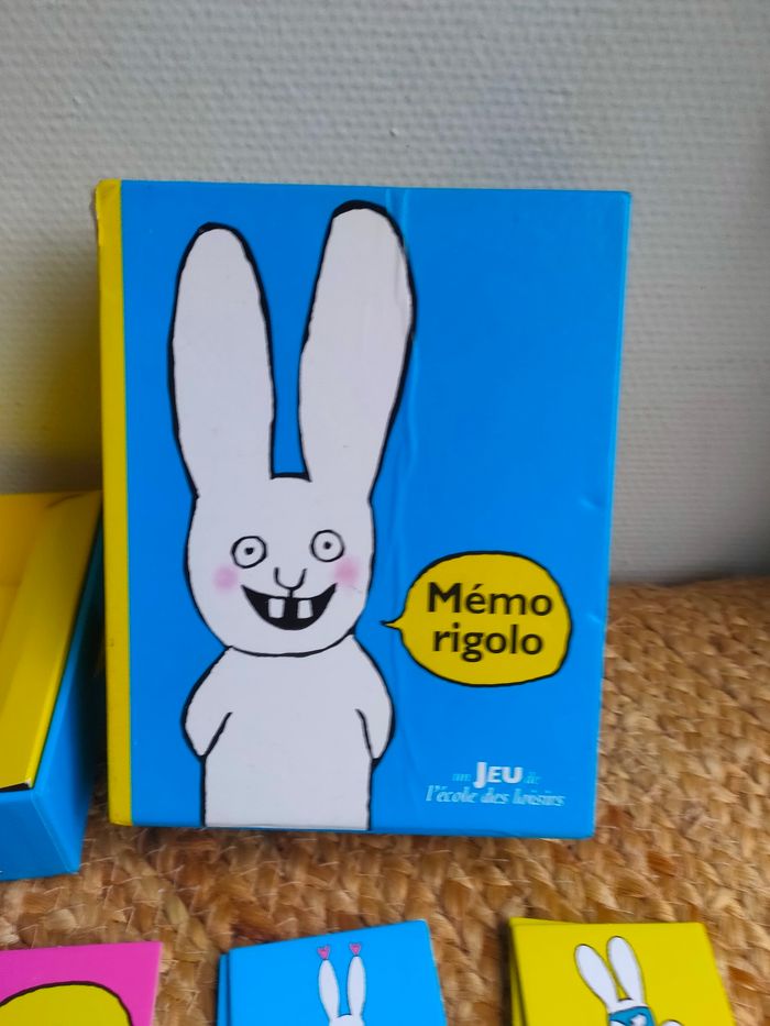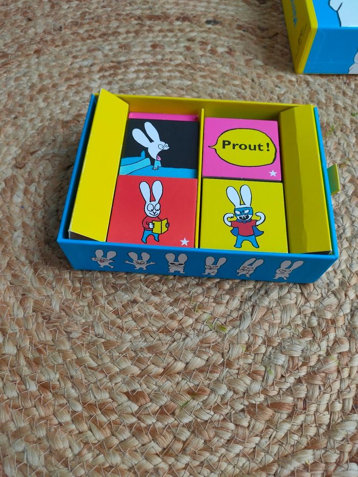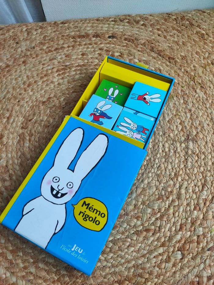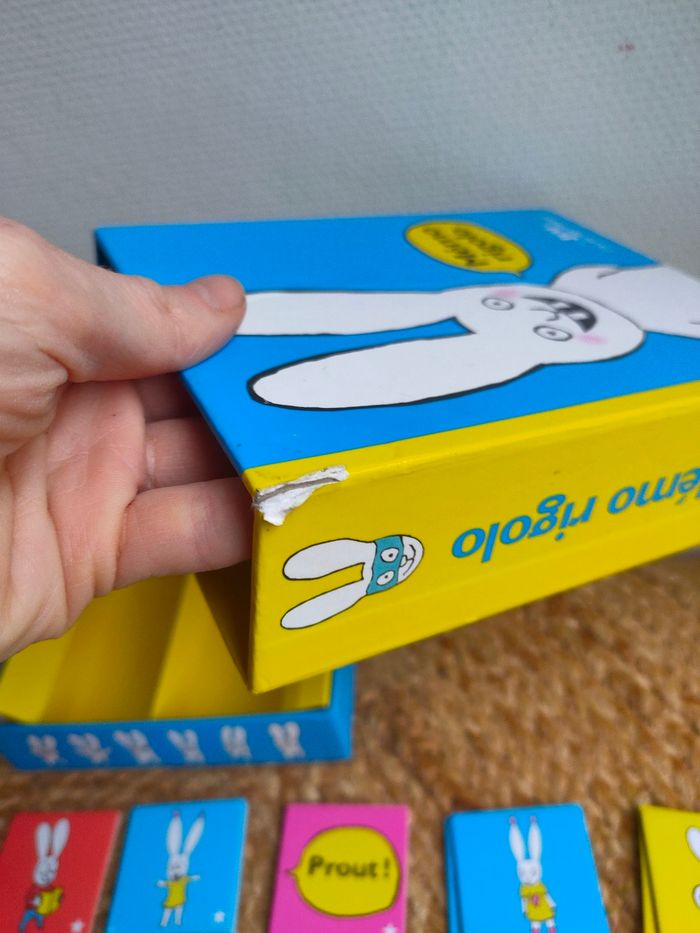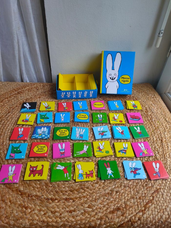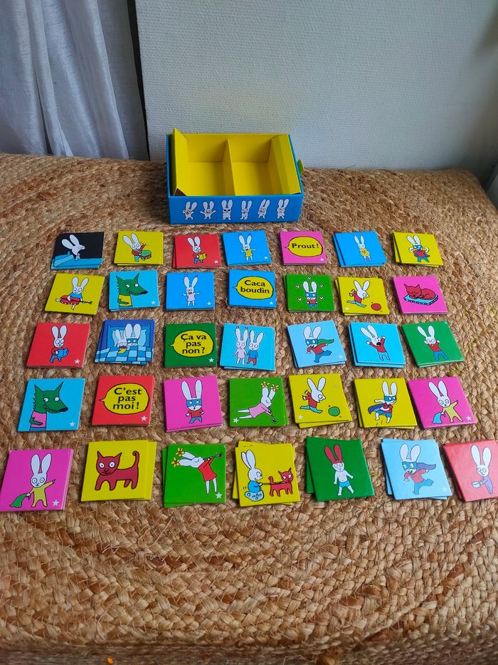 Mémory évolutif illustré par l'univers de Simon, le lapin de Caca boudin, où les joueurs doivent reconstituer les paires de cartes identiques, avec deux niveaux de difficultés. Le jeu a été manipulé, il a des traces sur la boîte, il y a 70 cartes. Prix ferme, PAS DE NÉGO !!!