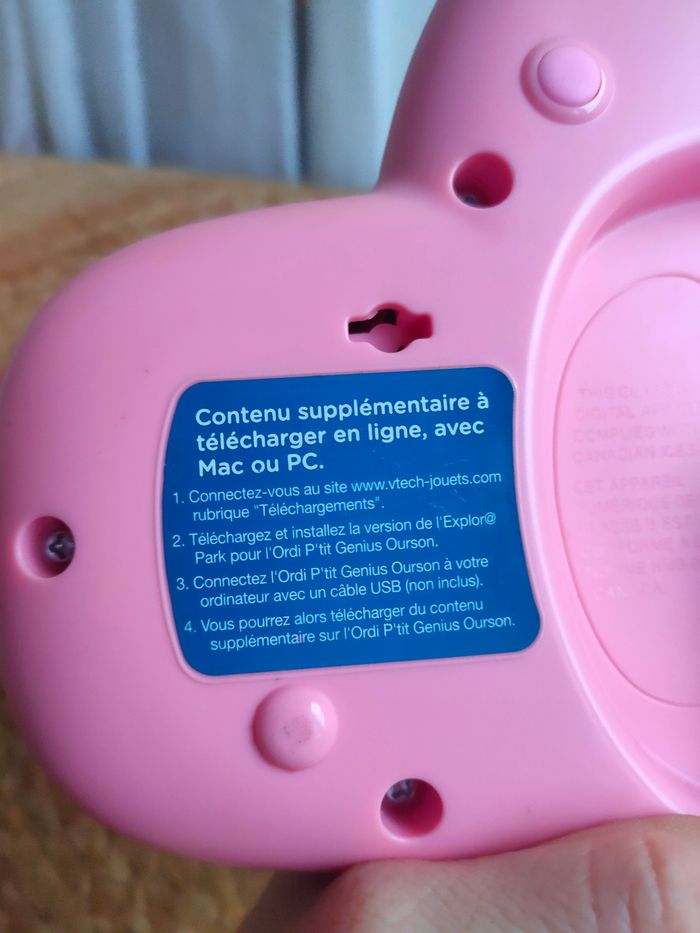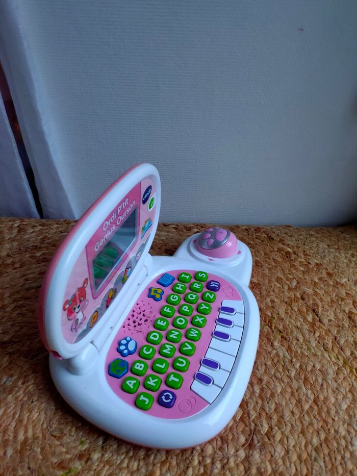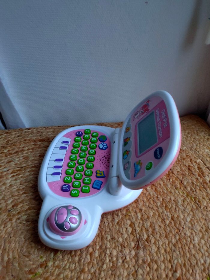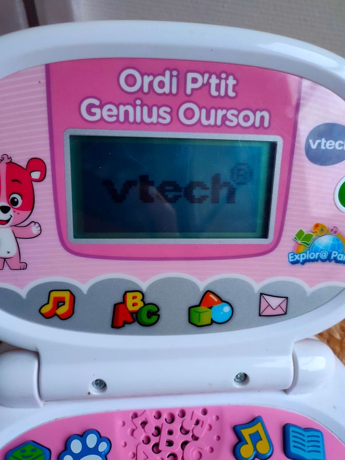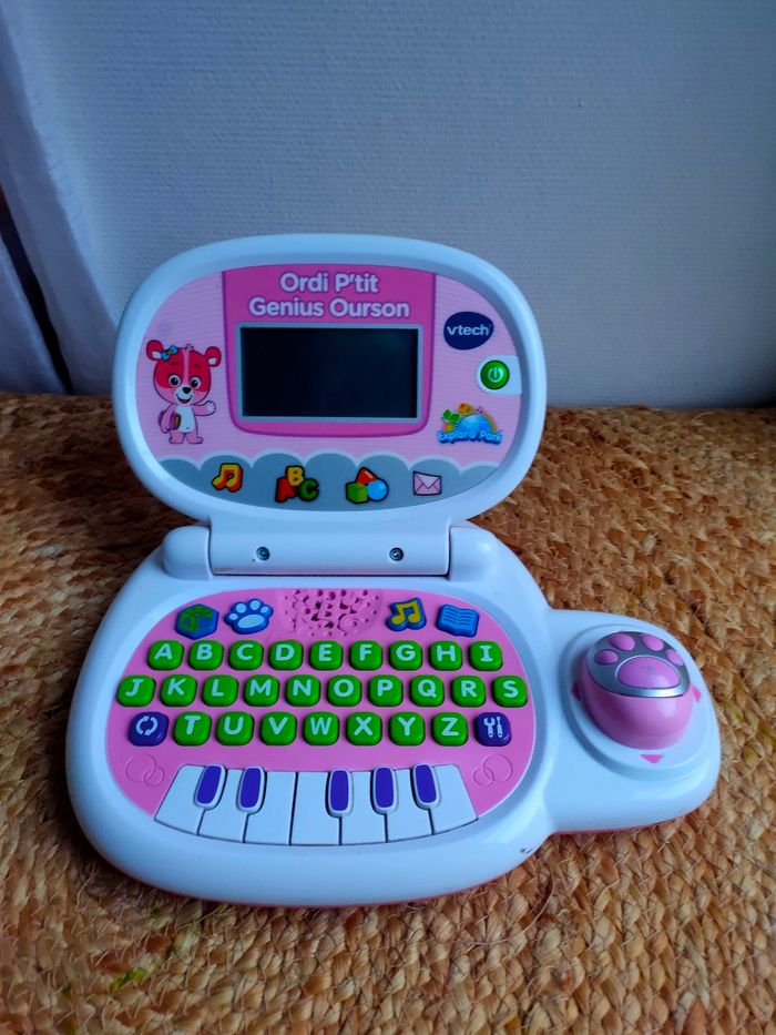 Ordi P’tit Genius Ourson est un ordinateur éducatif grâce auquel tu pourras accompagner un petit ourson dans ses aventures et découvrir avec lui les lettres et leur prononciation, 26 mots nouveaux, les formes et les instruments de musique. Ordi P’tit Genius Ourson se connecte aussi sur l’application Explor@ Park pour enrichir et personnaliser son contenu. Il est en très bon état, fonctionne parfaitement. Vendu sans piles.