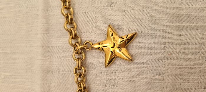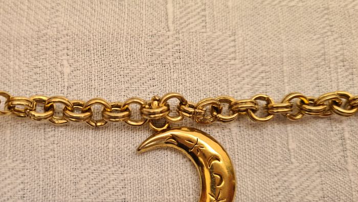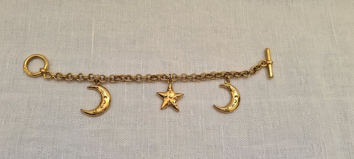 Bracelet doré chaîne style forçat avec des doubles anneaux. 3 breloques : 2 croissants de lune, 1 étoile gravées de petites lunes et étoiles Fermoir à bascule Marque CCB, article collector, rare dans cet état. Peut-être envoyé dans du papier de soie et un pochon en organza. Idée cadeau Dim : longueur du bracelet 19 cm breloques 2 x 2 cm Fermoir anneau 1.5 cm, barre 2.5 cm Peu porté reste en très bon état. #braceletdoré #braceletàbreloques #lune #etoile #ccb #fermoiràbascule #mar-taybijoux