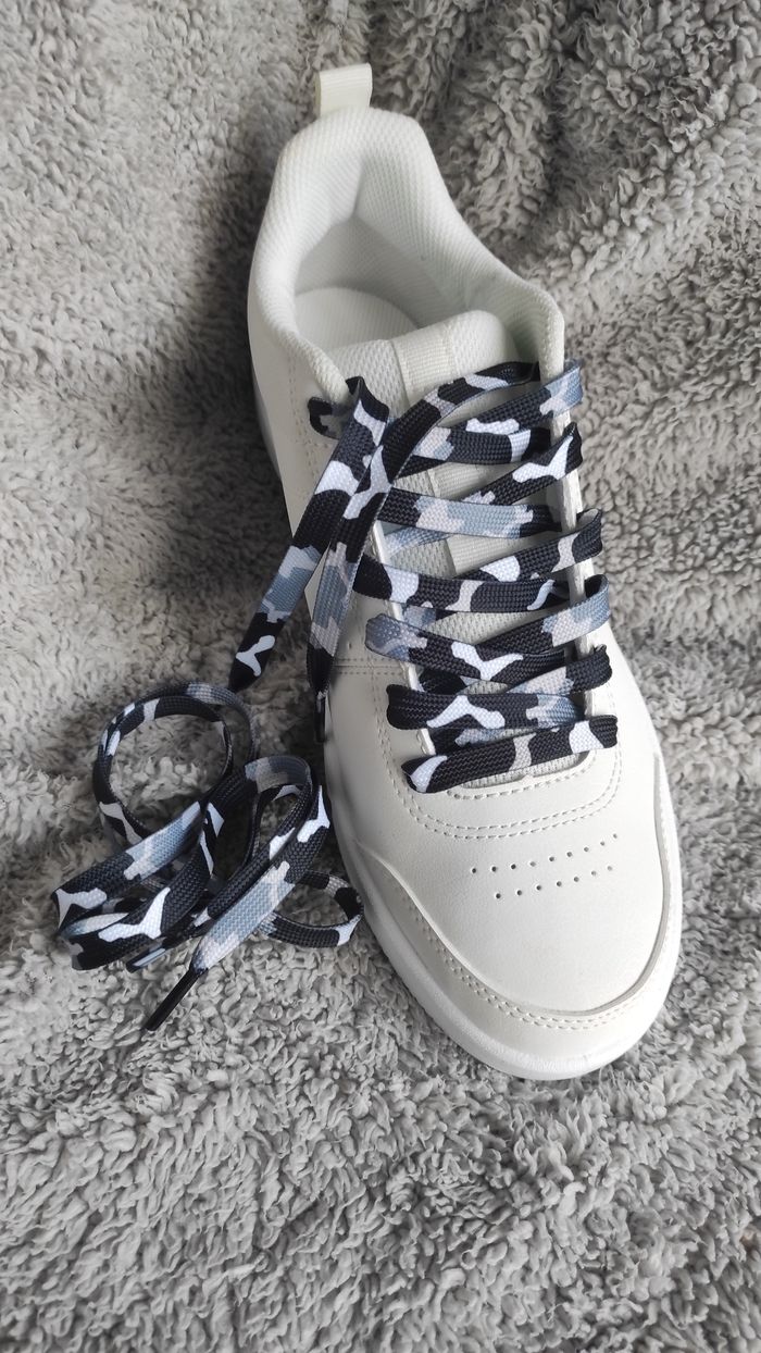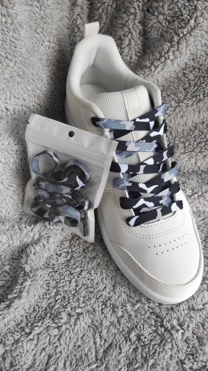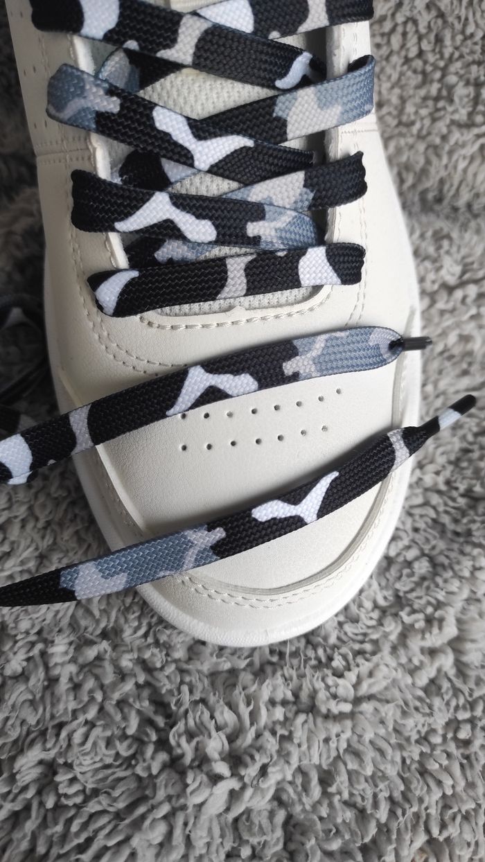 ⚫ Lacets camouflage noir – 120 cm (édition urbaine) Sobre mais stylé : ces lacets camo noirs ⚫ D’autres couleurs disponibles : violet, rose, bleu, bleu clair, vert, rouge. Un classique qui s’associe avec toutes les sneakers. ✔️ Longueur : 120 cm ✔️ Neuf 💰 Tarifs : 1 paire : 3 € 👉 Contacte-moi en MP pour un lot avec tes quantités et couleurs préférées.