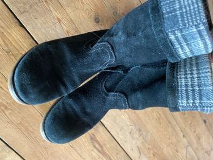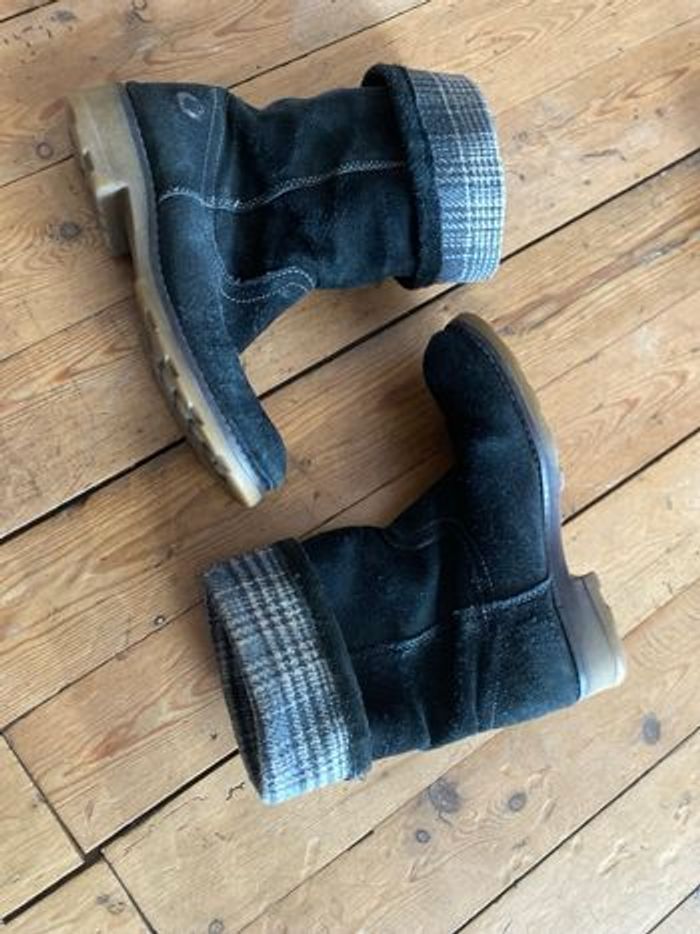 Bottes en cuir daim noir véritable Peuvent se porter sans revers ou encore avec revers écossais tartan gris beige Pointure 37 Semelles crêpe Marque Roxy
