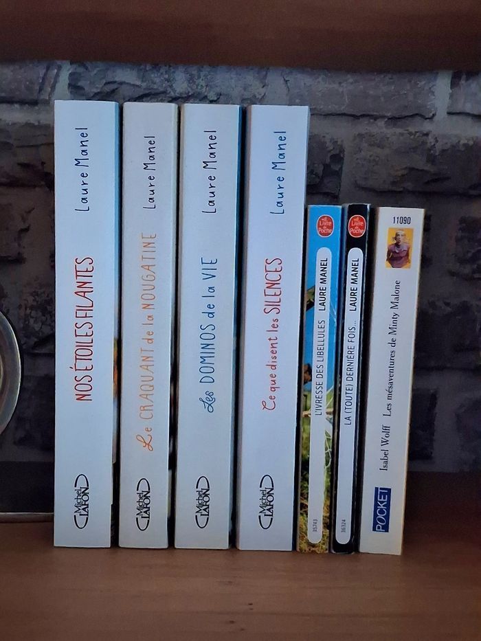 5 romans de Laure Manel Grand format - Edition Michel Lafon Nos étoiles filantes (vendu) ✏️ Ce que disent les silences (2023) ✏️ Les dominos de la vie (2022) ✏️ Le craquant de la nougatine (2021) - Couverture marquée Très bon état Edition Le livre de poche ✏️ La toute dernière fois Bon état - Couverture marquée ✏️ L’ivresse des libellules Très bon état Livre offert pour l’achat de cette annonce ✏️ Les mésaventures de Minty Malone Edition Pocket Très bon état Très bon état général. Il s’agit de livres d’occasion qui ont été manipulés. Les défauts sont mentionnés dans la description et visibles sur les photos. Livraison acceptée ou remise en main propre possible sur Paris, Bibliothèque François Mitterand, Gare de Lyon, La Défense, Etampes