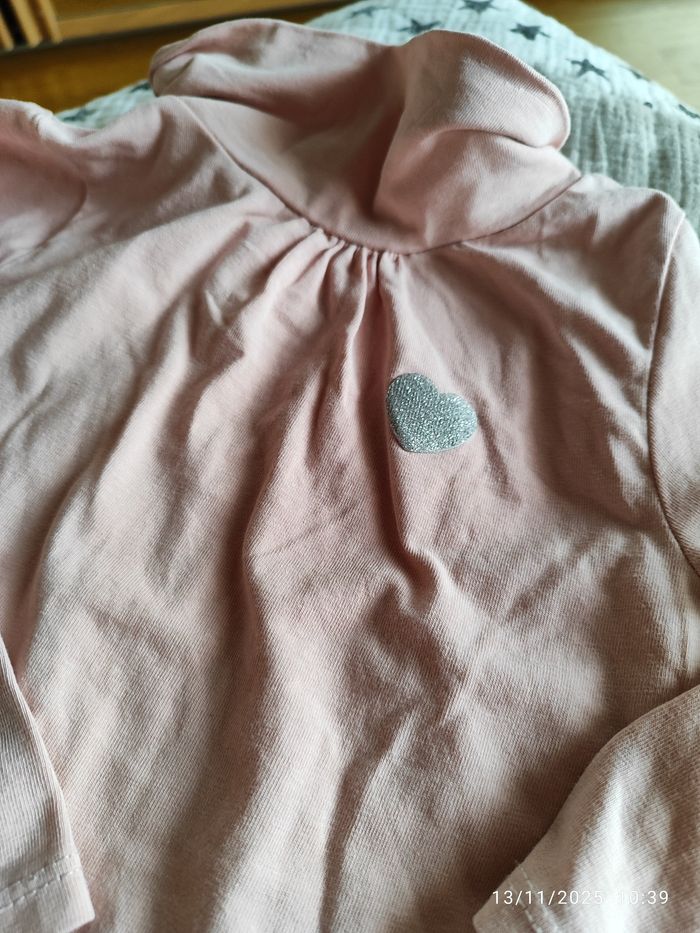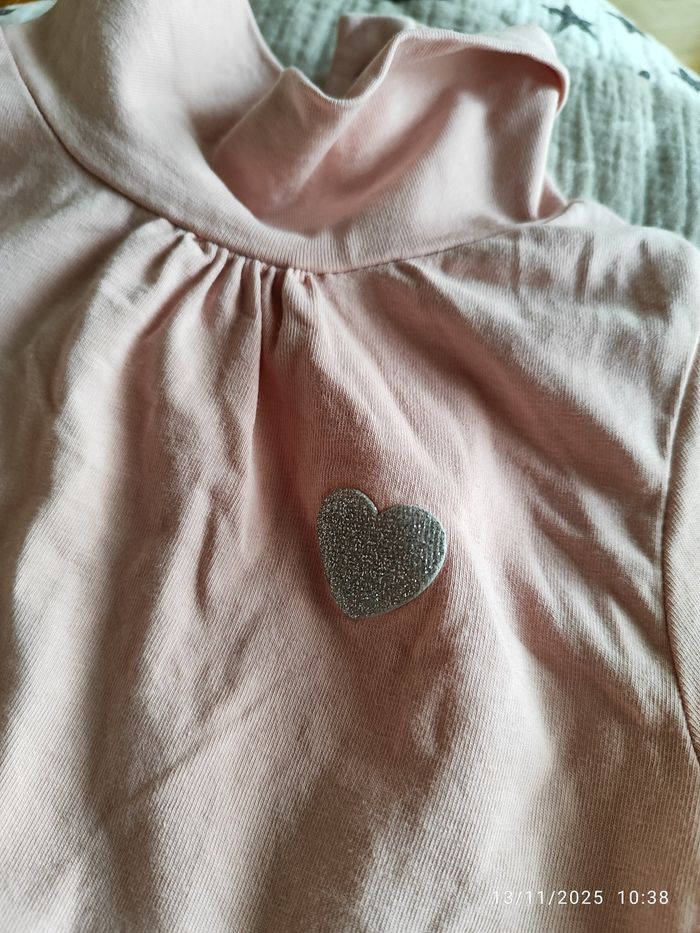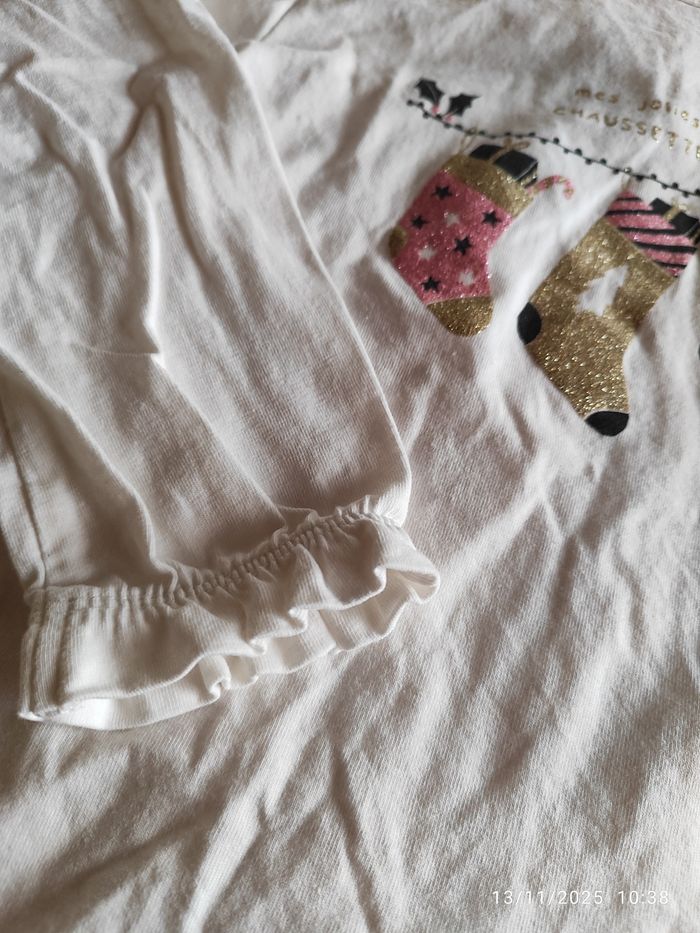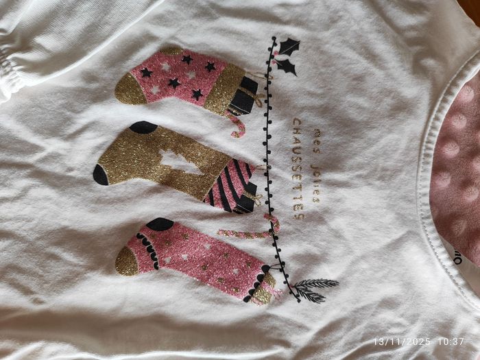 Haut manche longue noel porté 2 x comme neuf . Chaussette de Noël sur fond blanc , et un sous pull rose clair avec un coeur . Très peu porté également. Taille 36 , 3 ans
