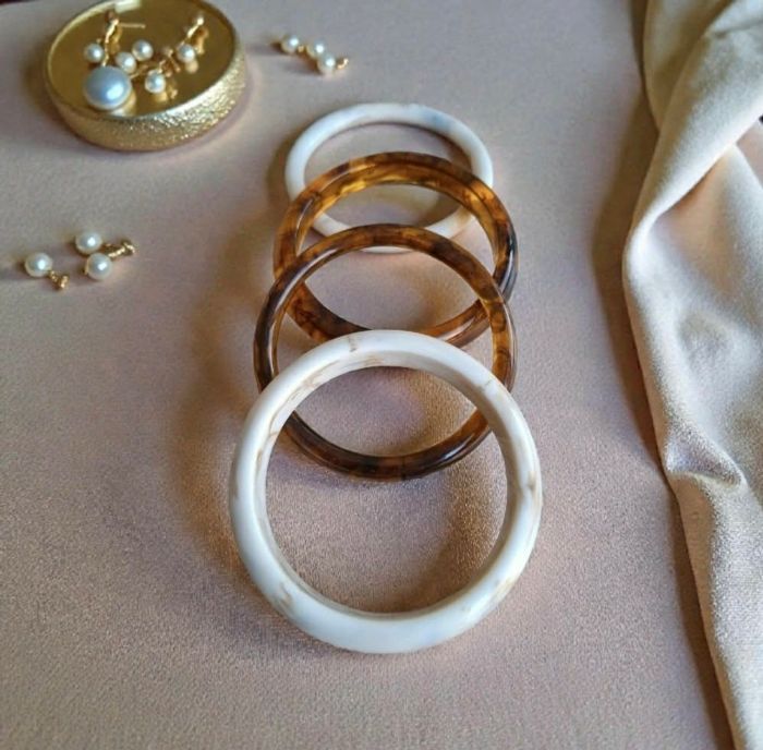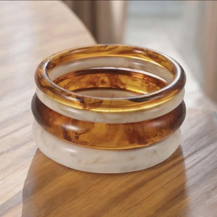 Lot de 4 jolis bracelets rigides en résine effet marbré, tons ambrés et ivoire. Style rétro / vintage, parfaits à porter ensemble ou séparément. En très bon état, aucune fissure. Le diamètre intérieur est de 67 mm Envoi rapide et soigné