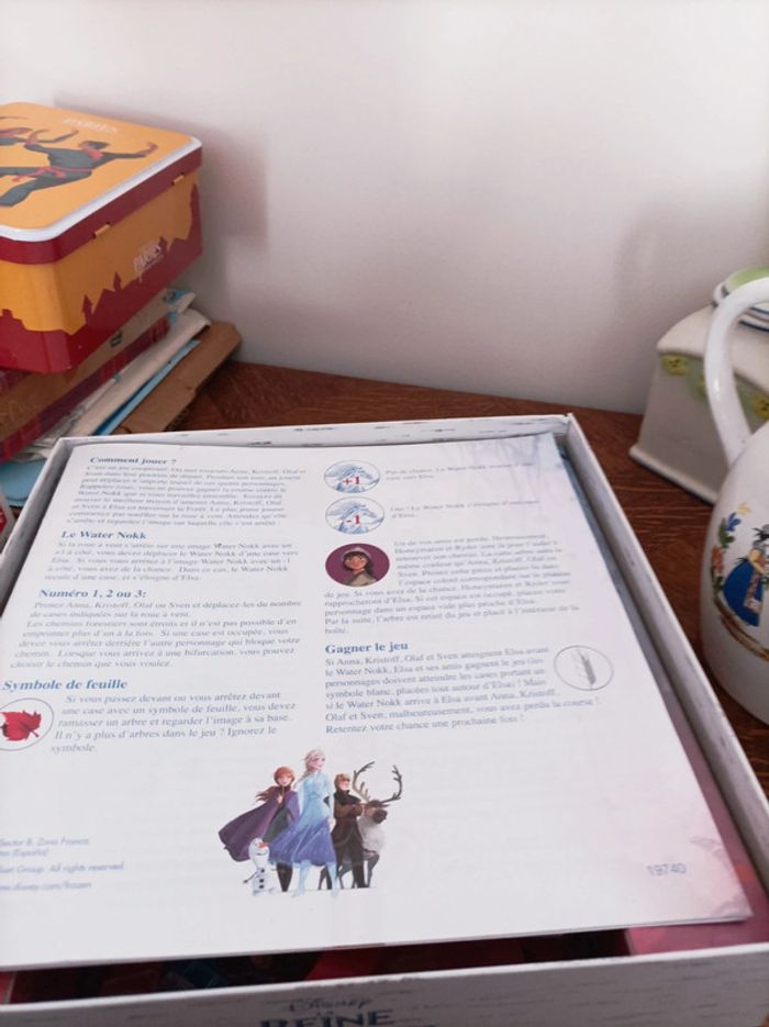 Jeu de société la véritable amitié Reine des Neiges complet et en très bon état La boîte contient la rose des vents, le plateau avec les 2 supports, 8 arbres en carton avec leur base, 6 personnages avec leur support et la règle du jeu à partir de 4 ans